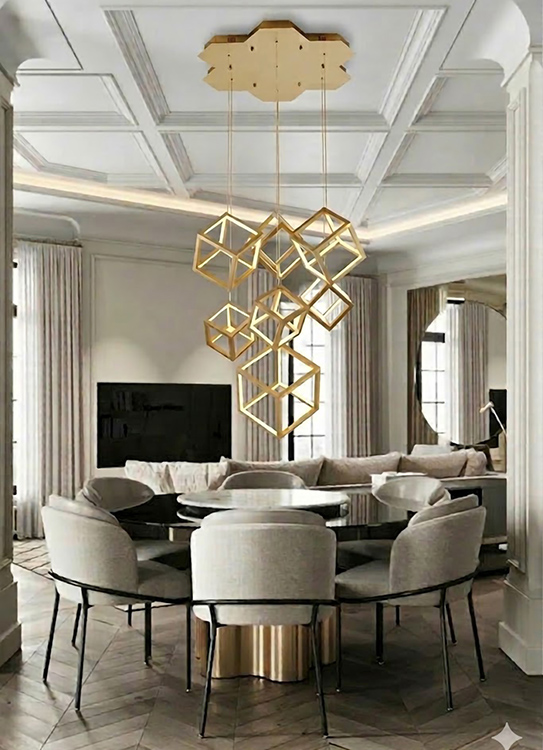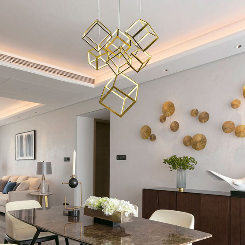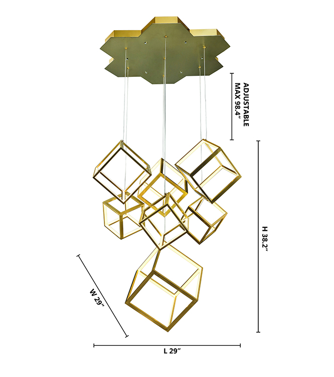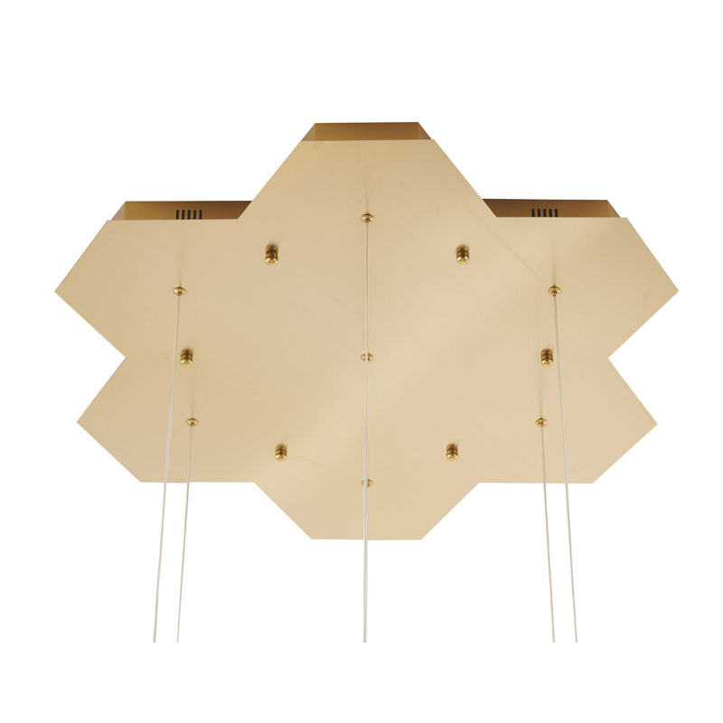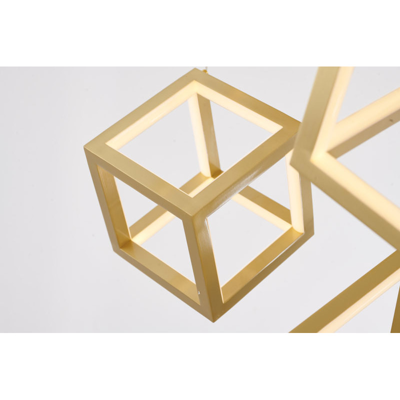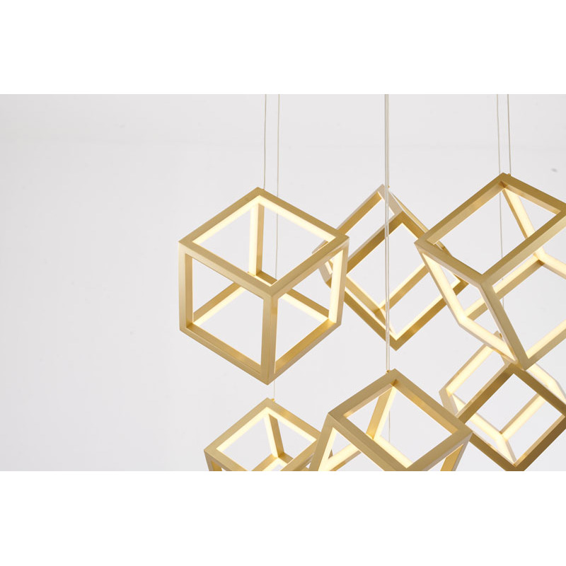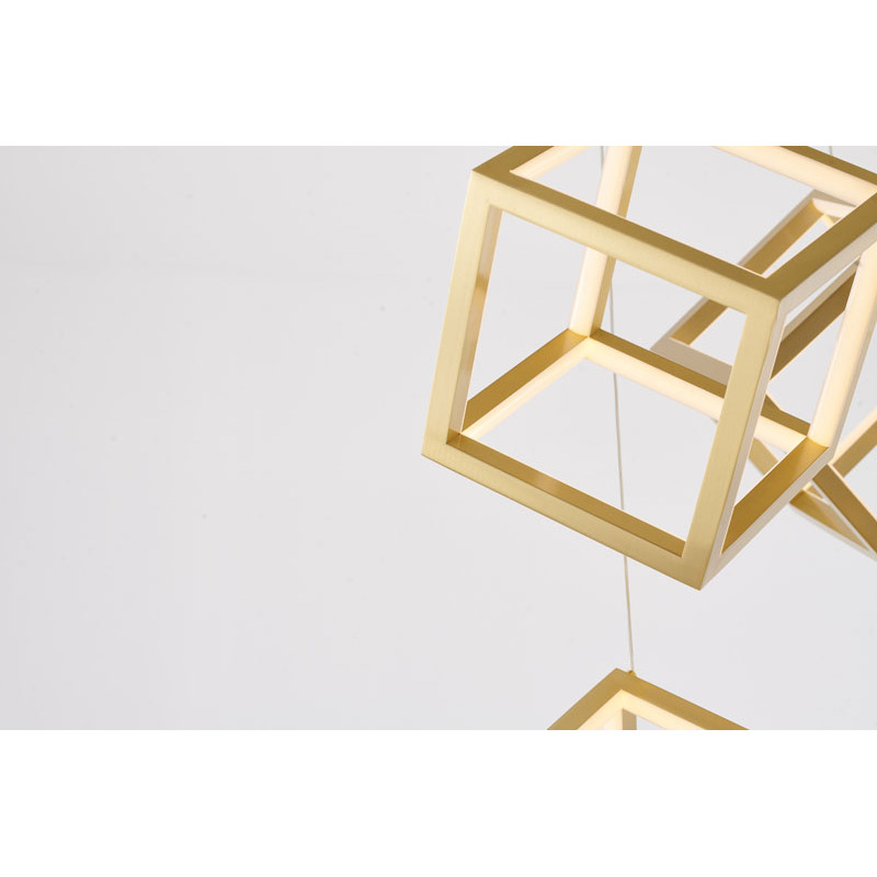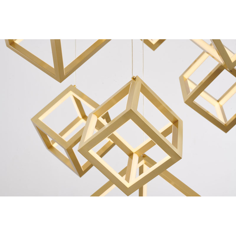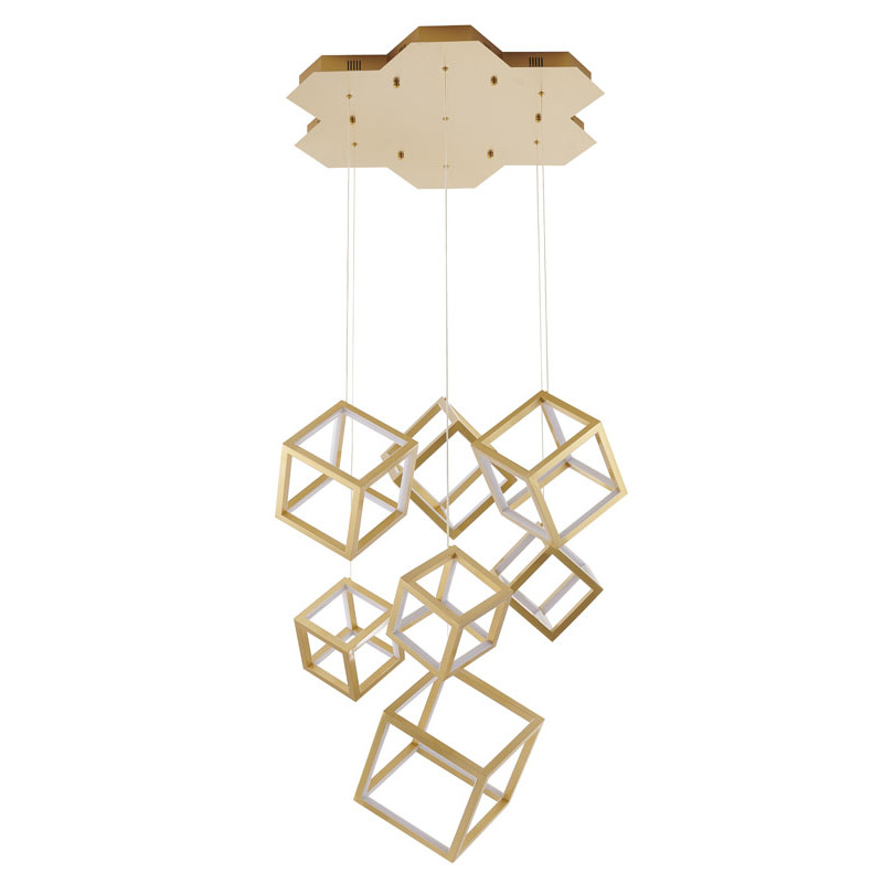 A SEVEN LIGHT LED FLOATING BOX CEILING FIXTURE IN A GOLD METAL FINISH