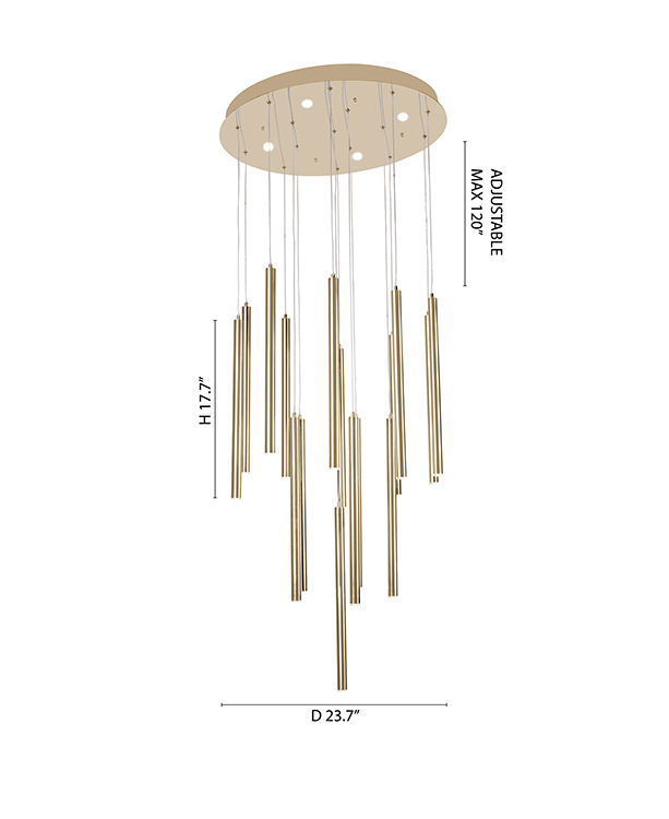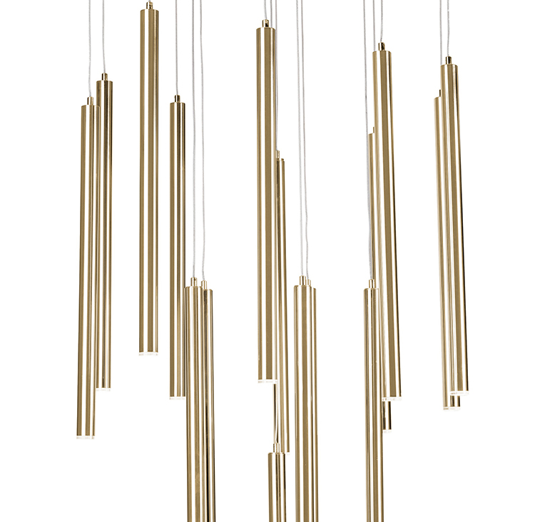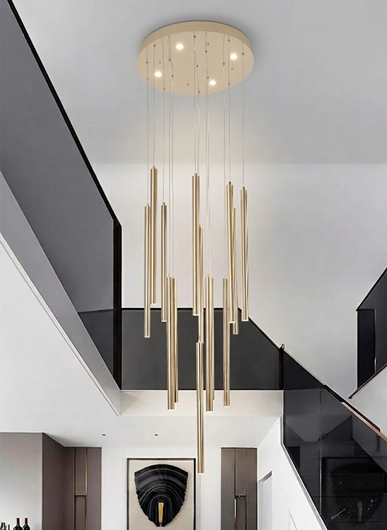 A GOLD FLUSHED LED CEILING FIXTURE WITH HANGING PENDANTS