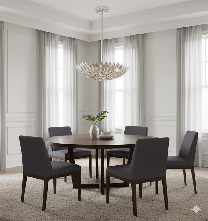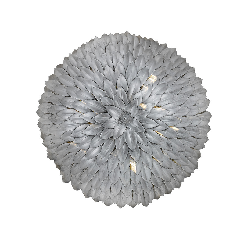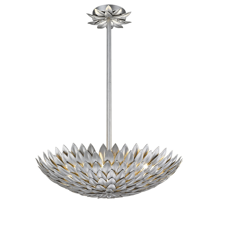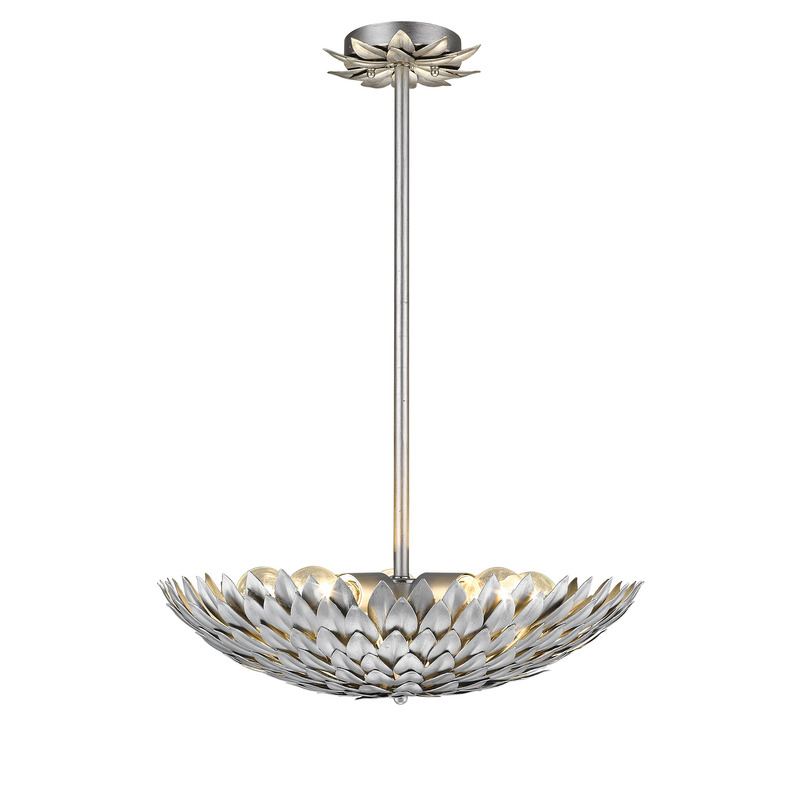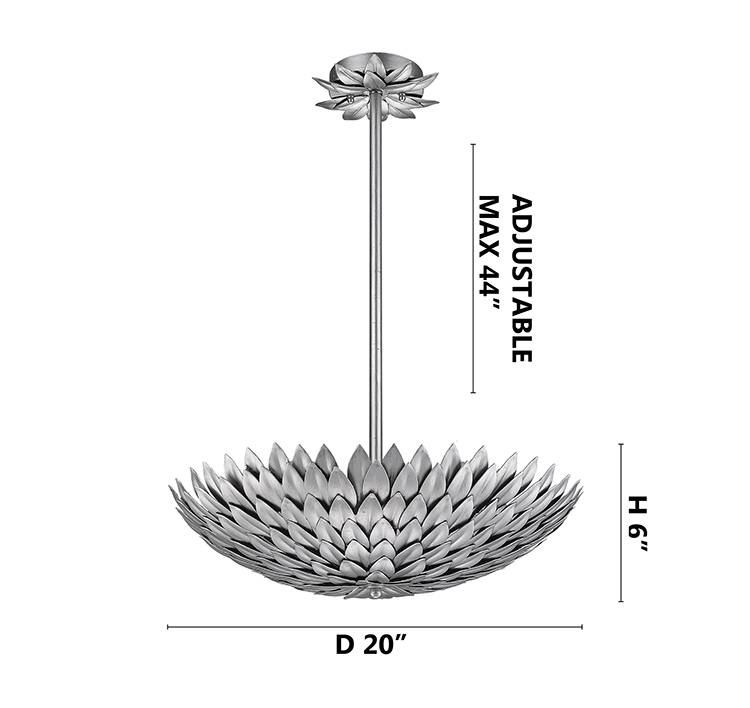 A HANGING SILVER LEAF PETAL LIGHT FIXTURE WITH A DECORATIVE LEAF CANOPY