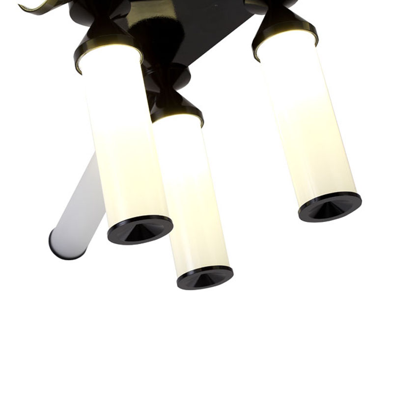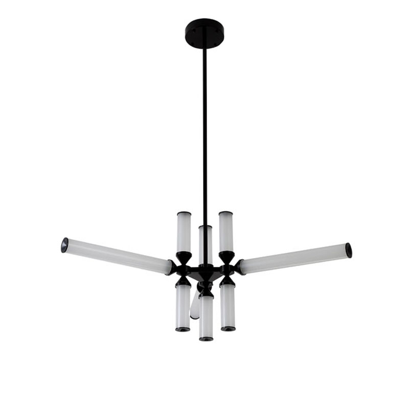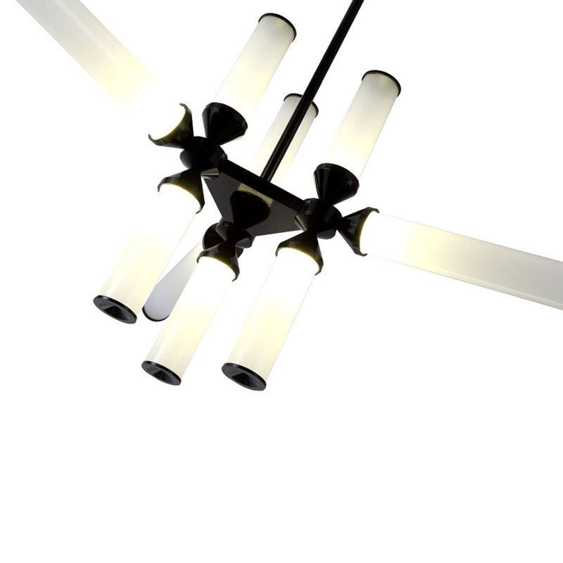 A BLACK ALUMINIUM FRAME CHANDELIER WITH WHITE GLASS SHADES