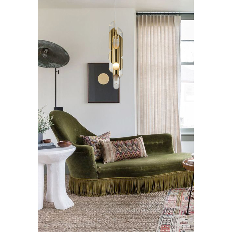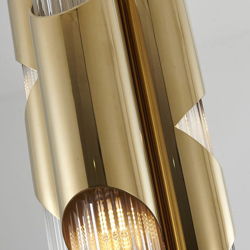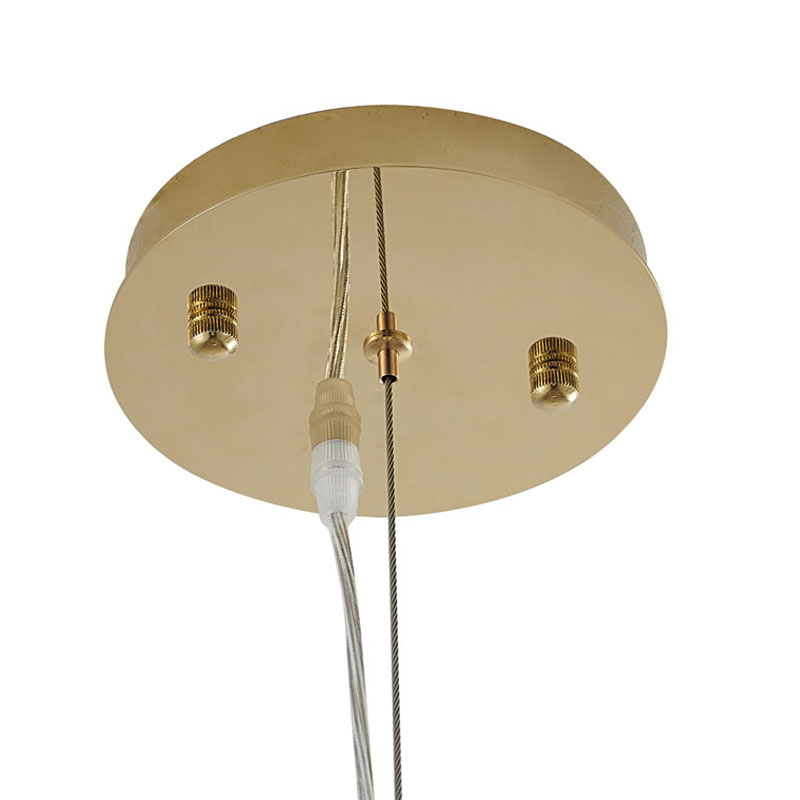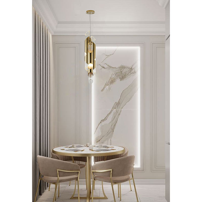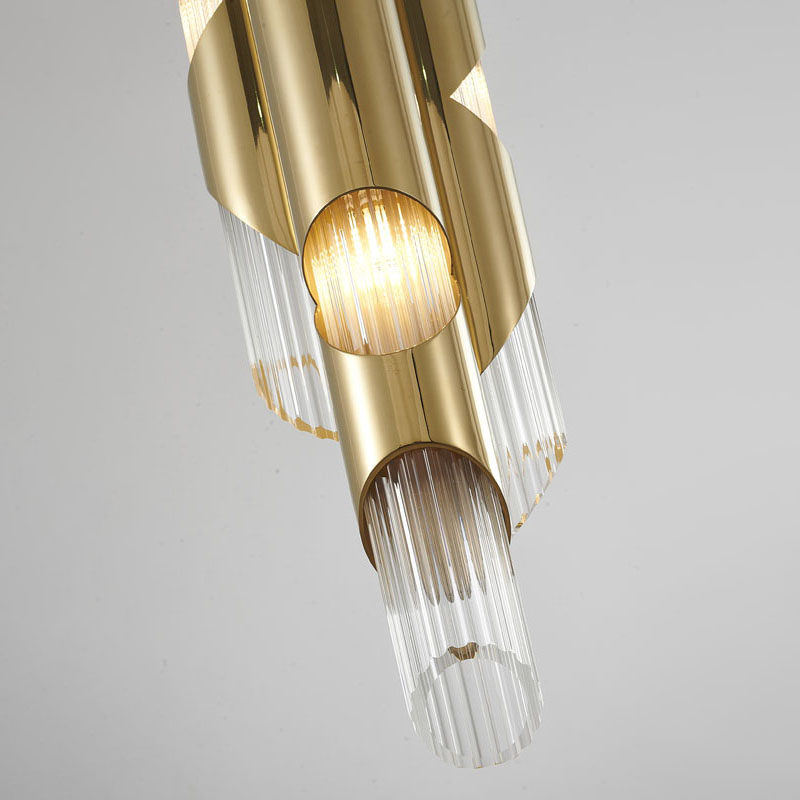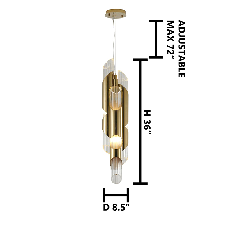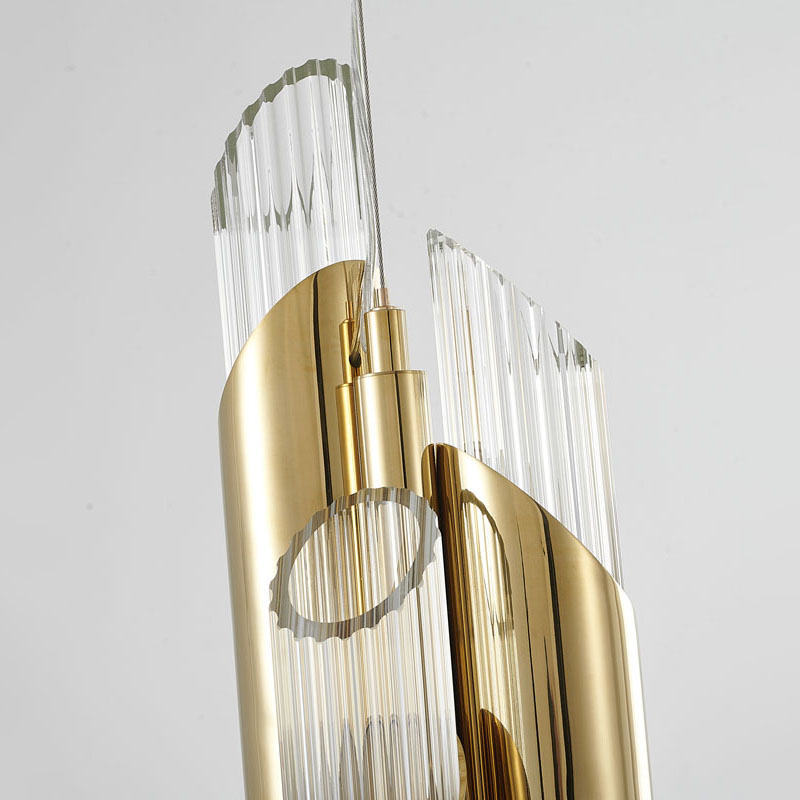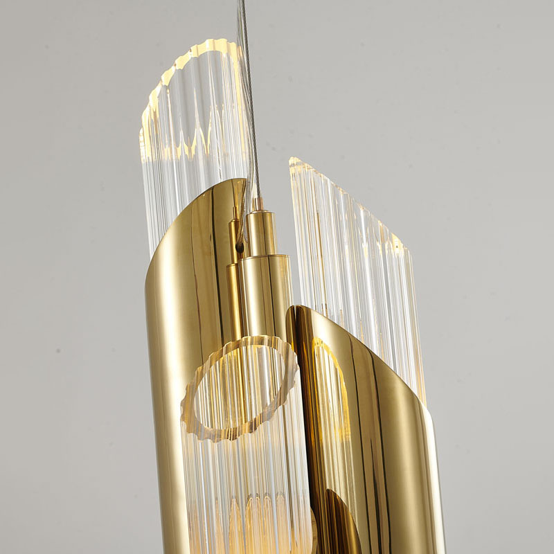 A GOLD STAINLESS STEEL PENDANT LIGHT WITH A CLEAR GLASS SHADE