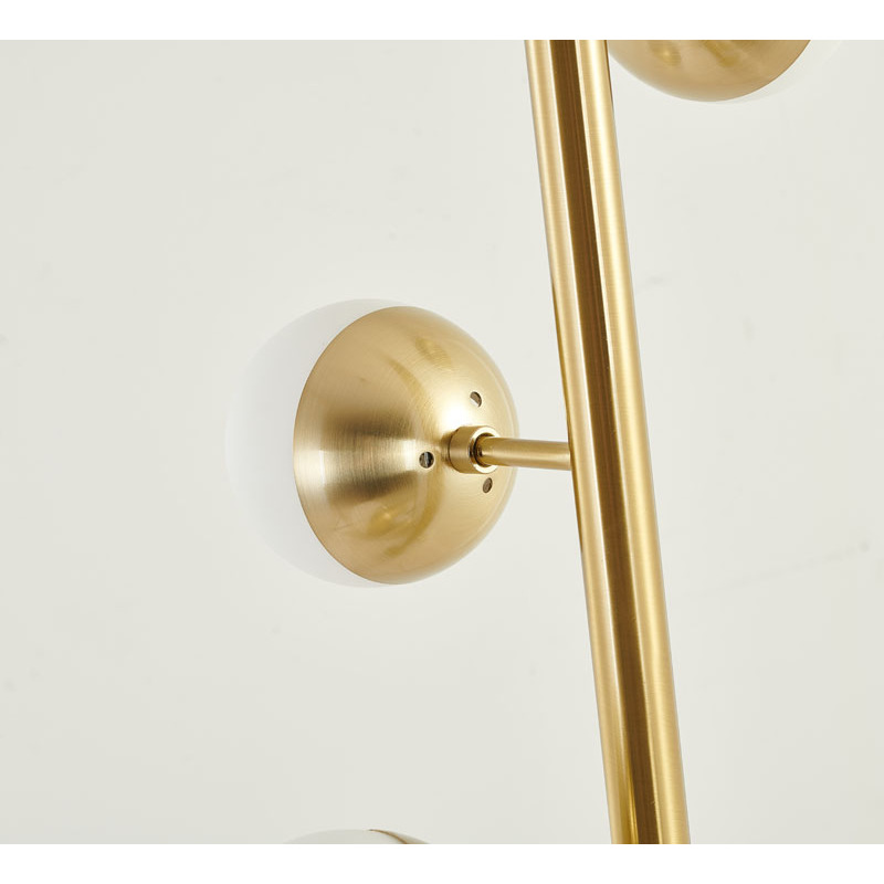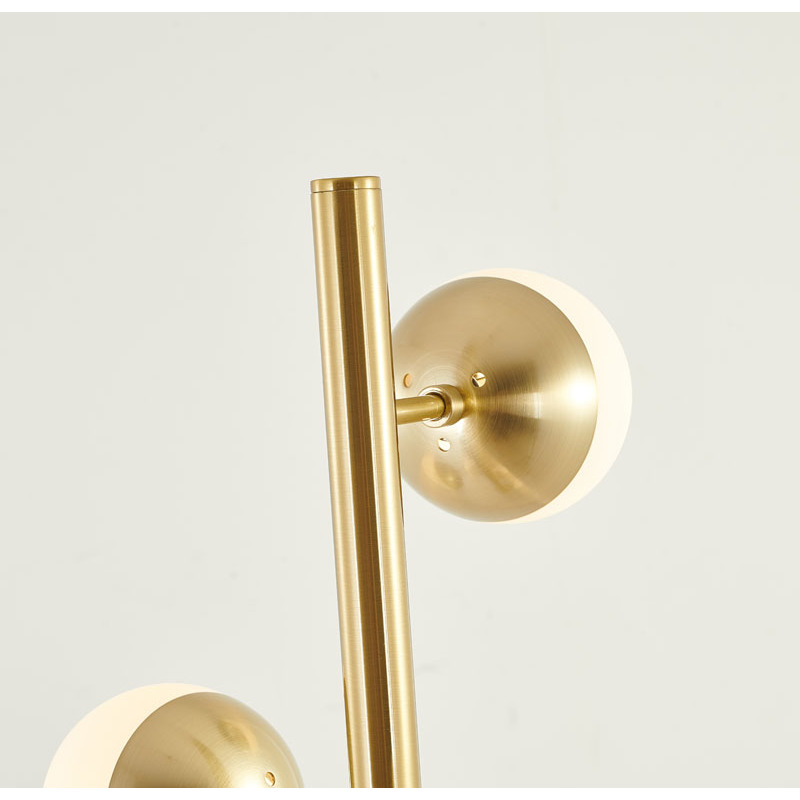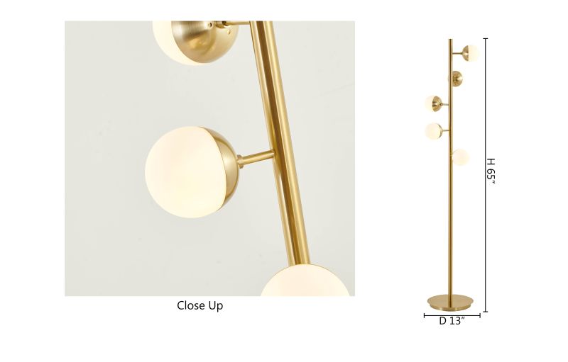 The brass plated metal traditional floor lamp with white glass shades is a stylish and functional desk lamp that features a brass-plated metal base and white glass shades. With a compact design, it measures 13 inches in diameter and 65 inches in height, making it a great addition to bedroom, living room, reading room, or office. The lamp uses five G9 base bulbs (Not Included) with a 40W power rating, providing ample lighting for reading, working, or simply adding ambiance to the space. Whether you're looking for a replacement lamp or a new addition to your decor, this lamp is a great option to consider.