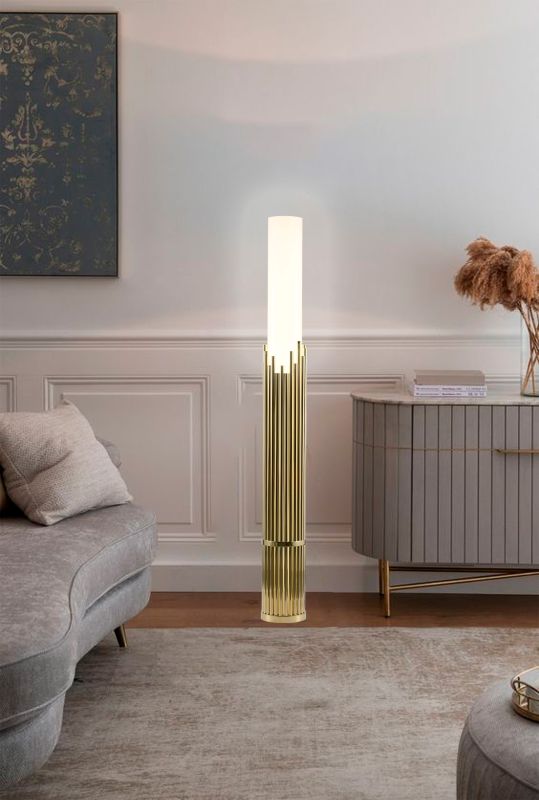CHAMPAGNE GOLD STAINLESS STEEL FLOOR LAMP WITH A WHITE ACRYLIC SHADE