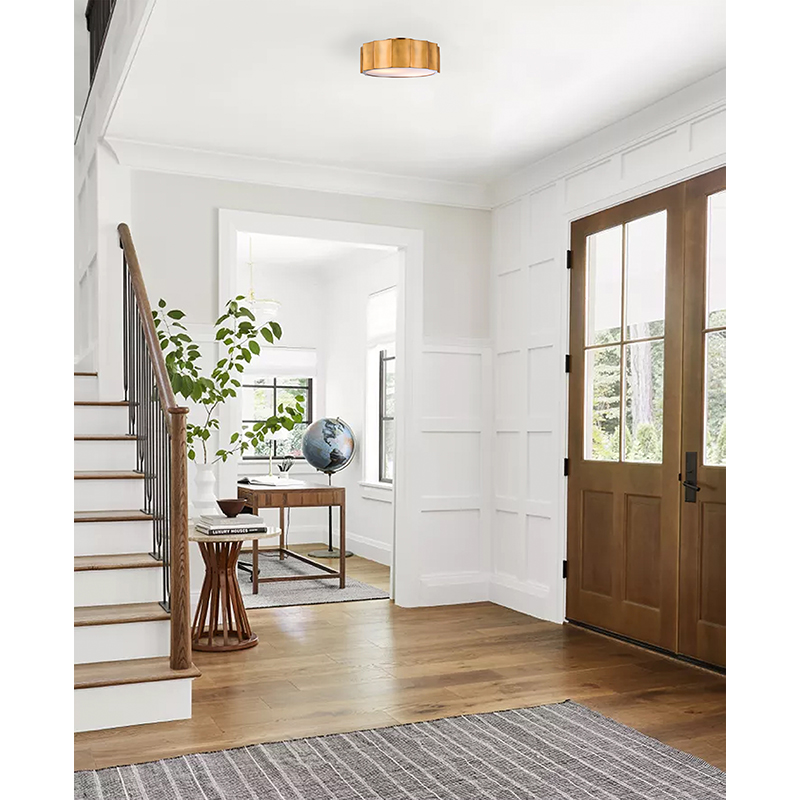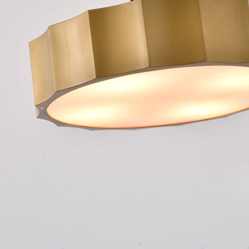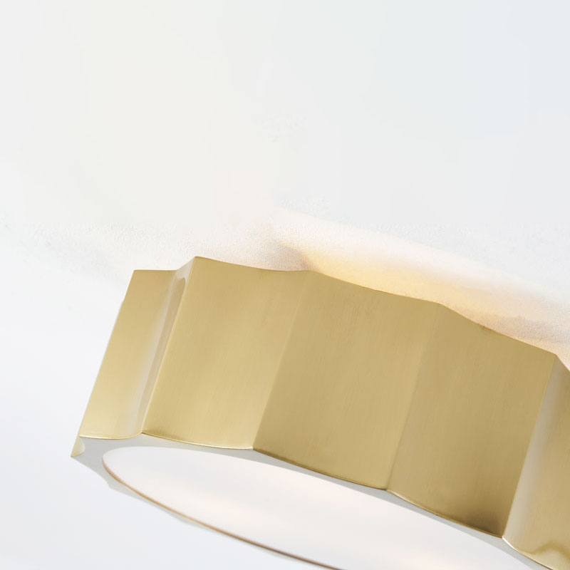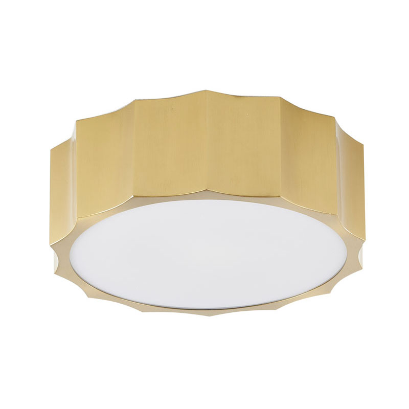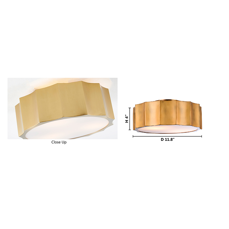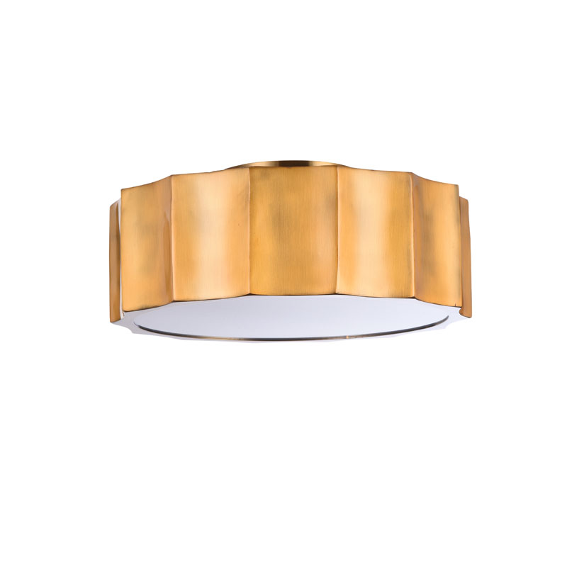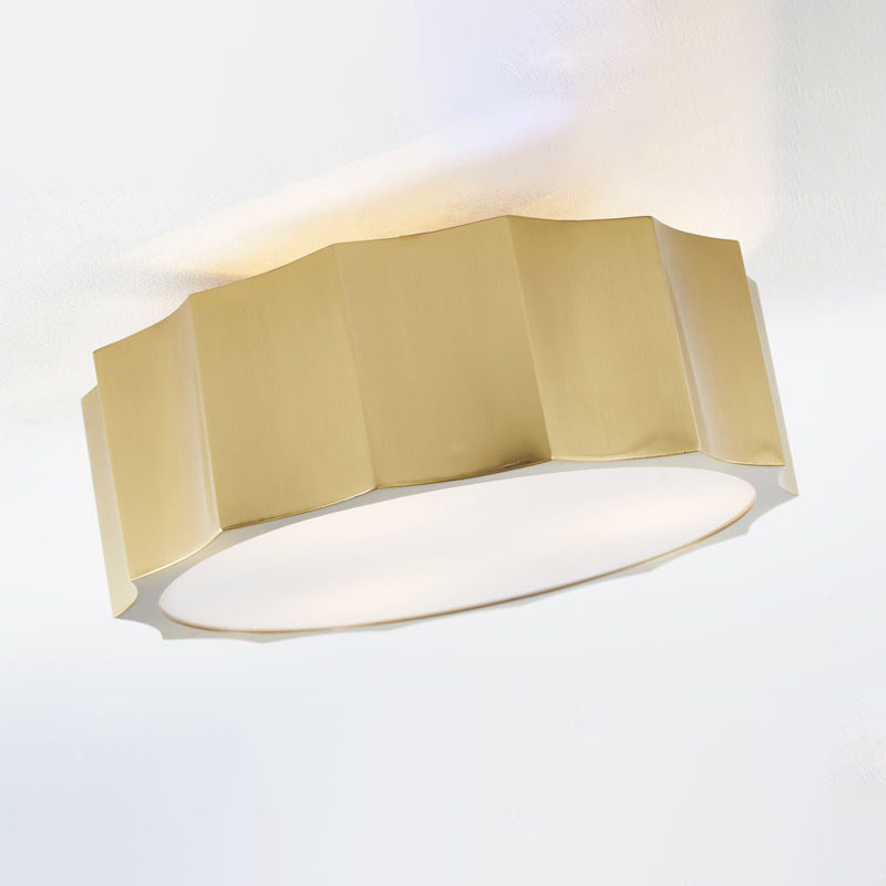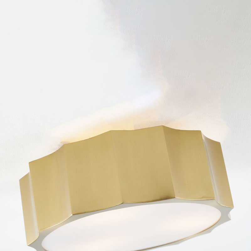 A BRASS IRON WAVE FLUSHMOUNT LIGHT WITH A WHITE ACRYLIC BOTTOM COVER