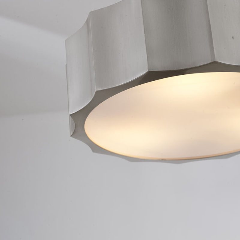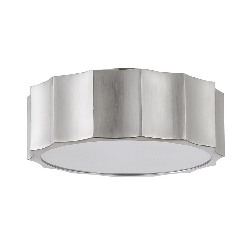 A SHINY NICKEL IRON WAVE FLUSHMOUNT LIGHT WITH A WHITE ACRYLIC BOTTOM COVER