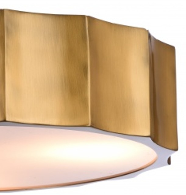 A BRASS IRON WAVE FLUSHMOUNT WITH A WHITE ACRYLIC BOTTOM COVER