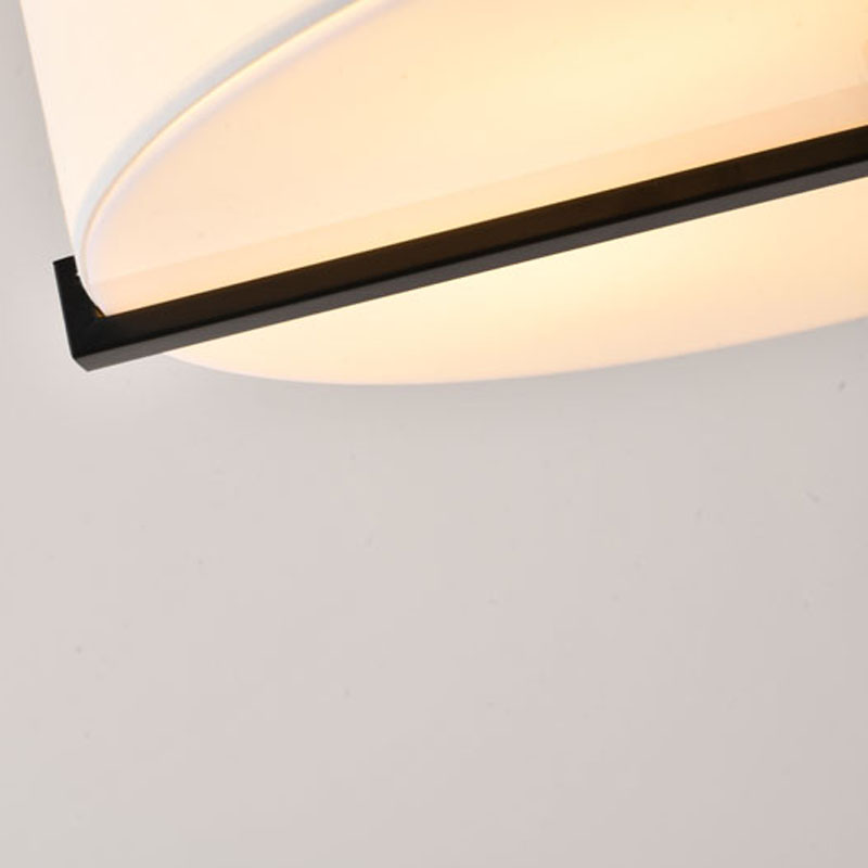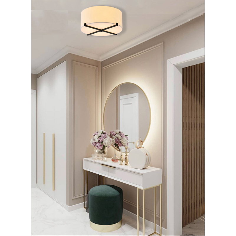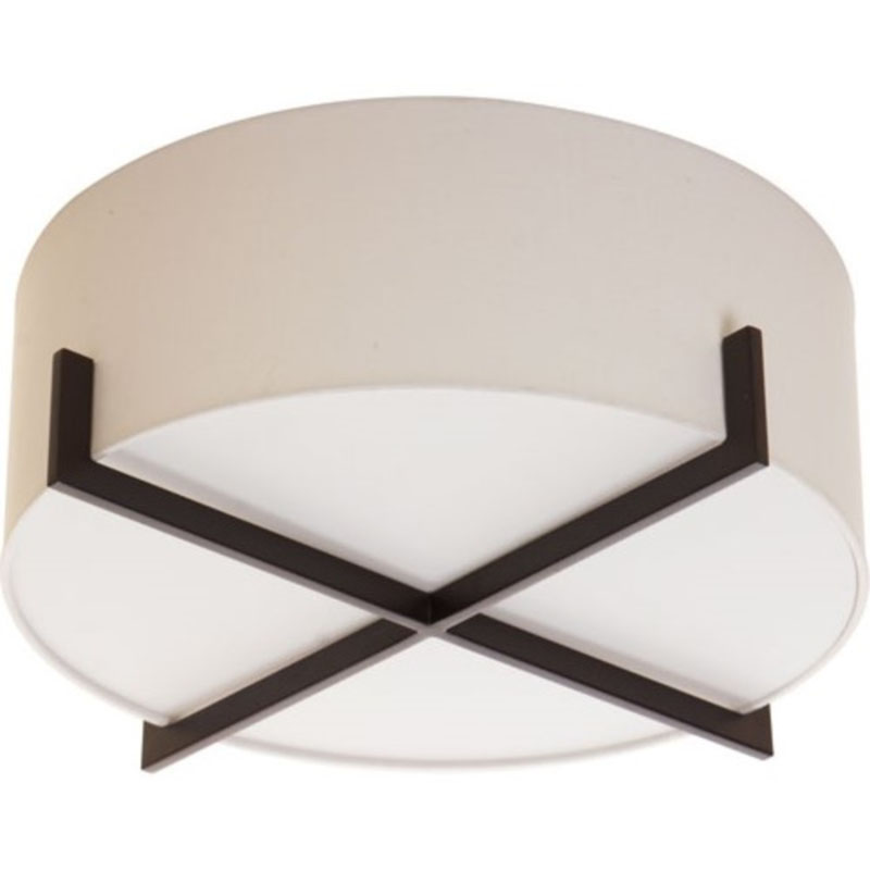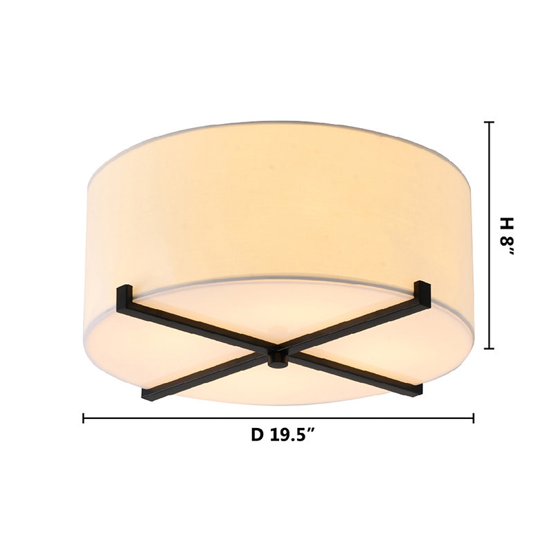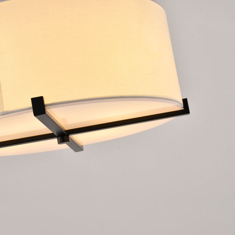 A WHITE FABRIC SHADE FLUSHMOUNT WITH A BLACK METAL FRAME