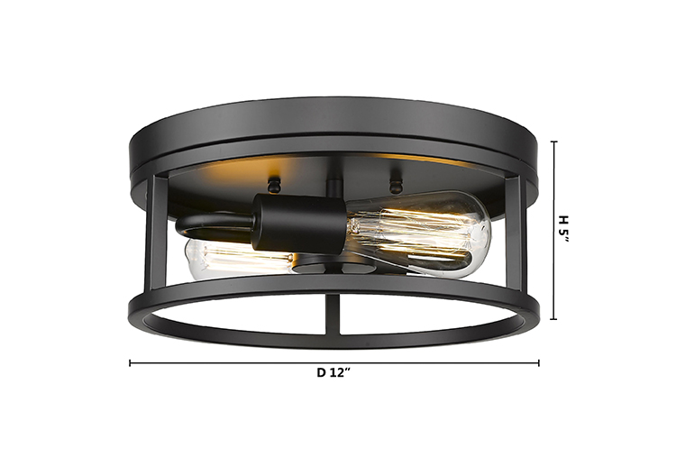 A ROUND BLACK IRON FRAMED FLUSH MOUNT LIGHT