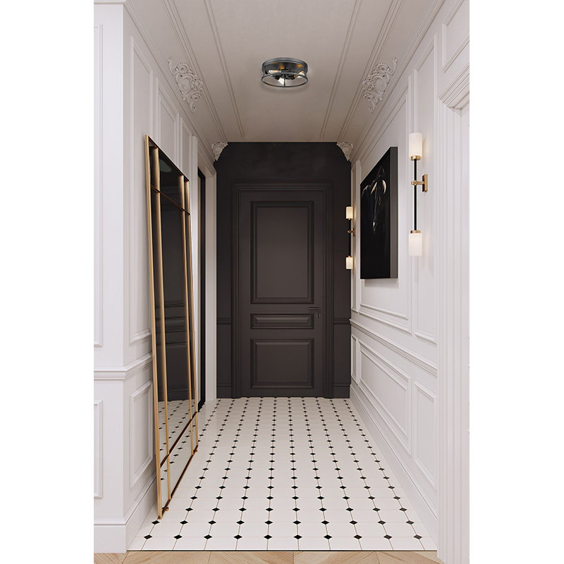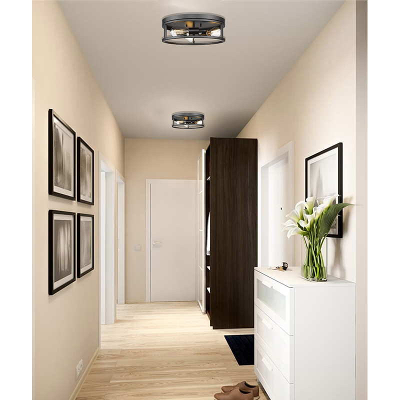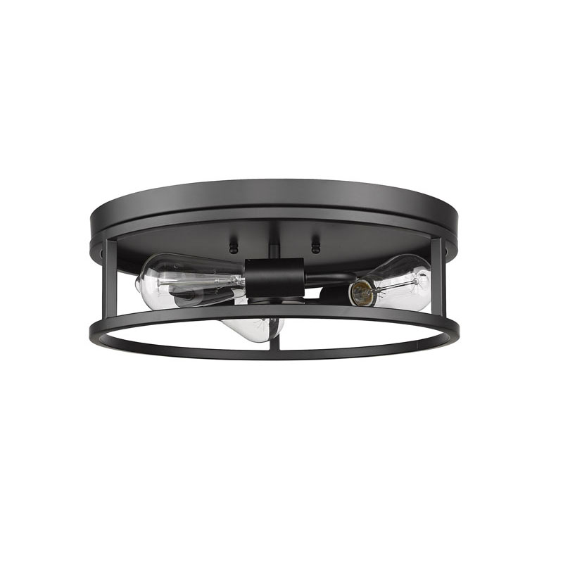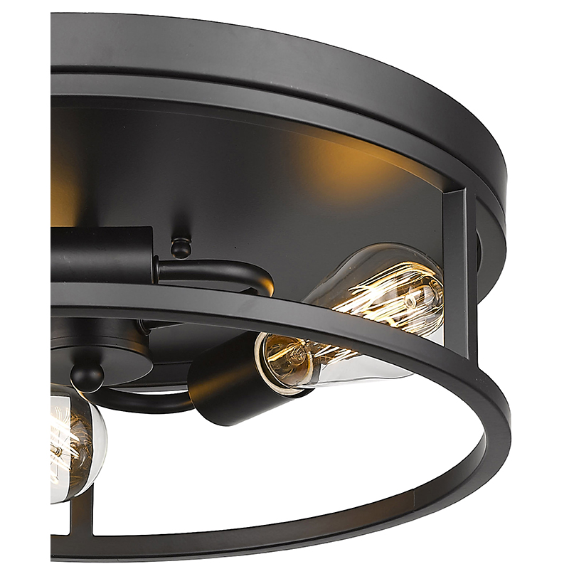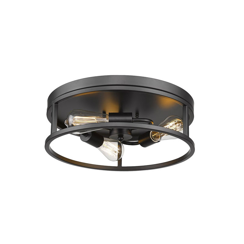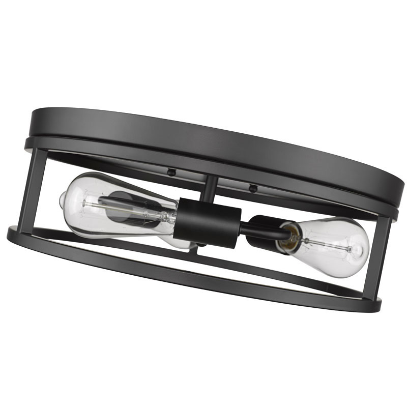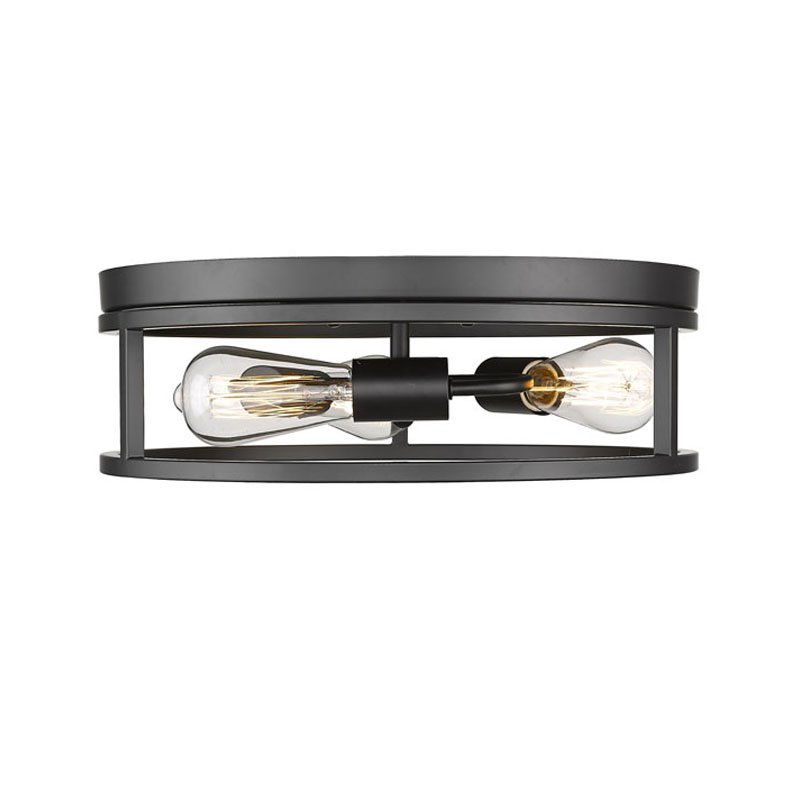 A ROUND BLACK IRON FRAMED FLUSH MOUNT LIGHT