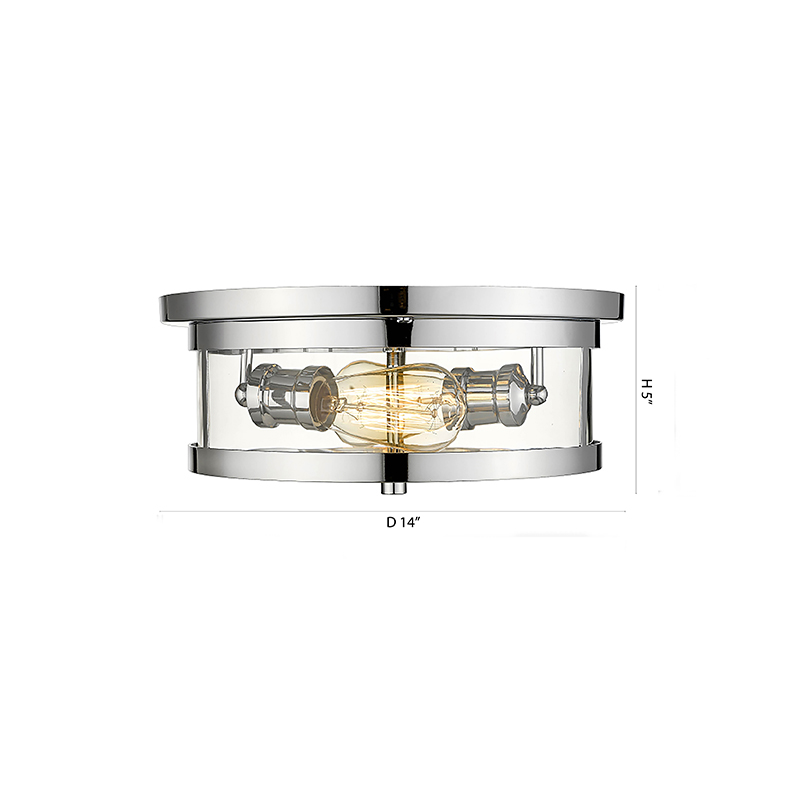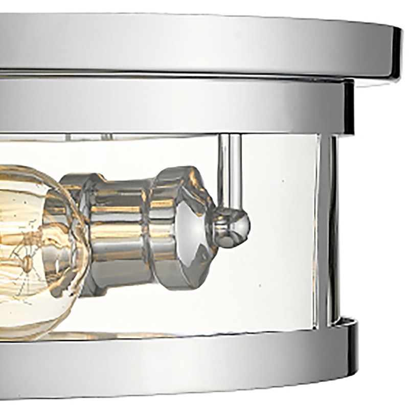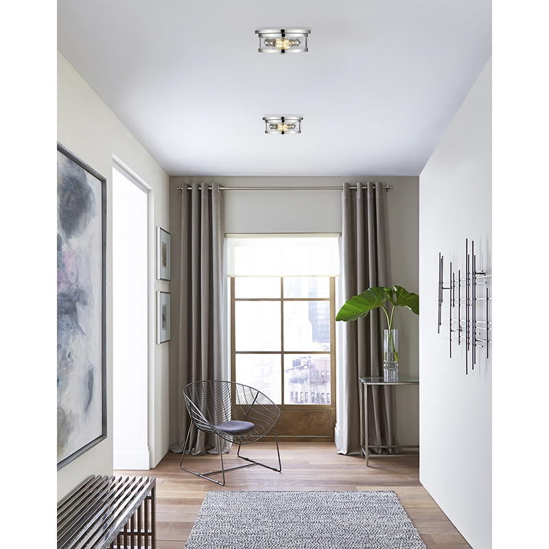 A CHROME ROUND FLUSH MOUNT WITH A CLEAR GLASS SHADE