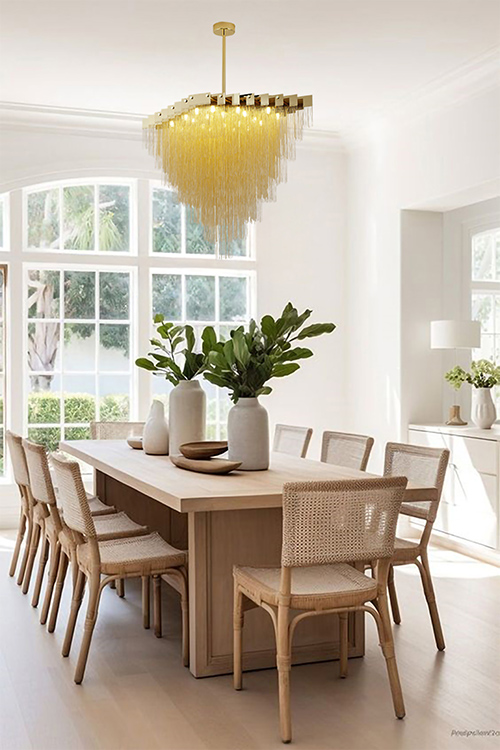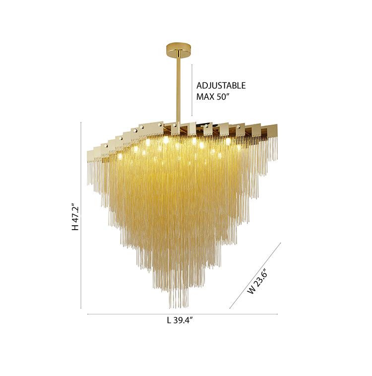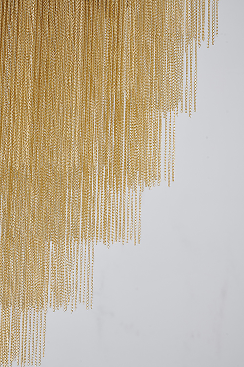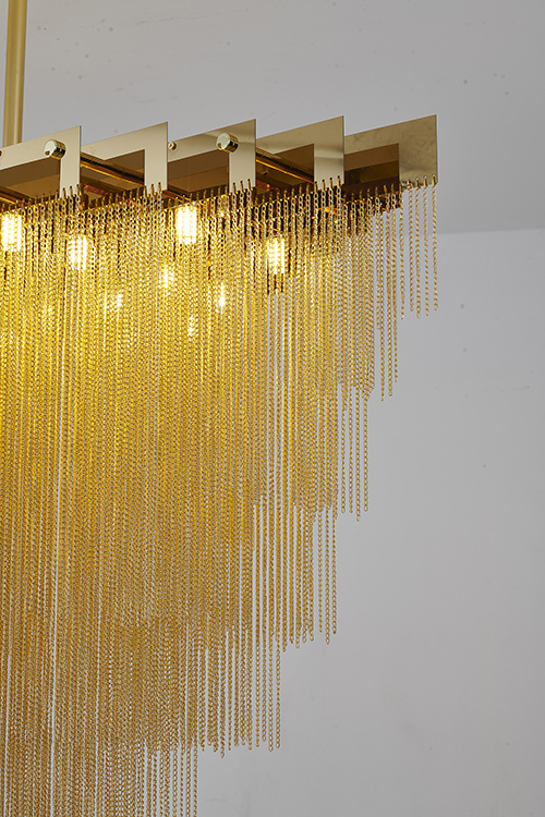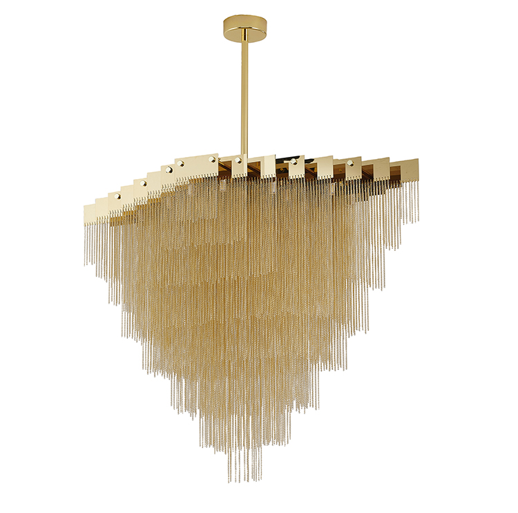 A GOLD PRISM CHANDELIER WITH HANGING ALUMINIUM CHAINS