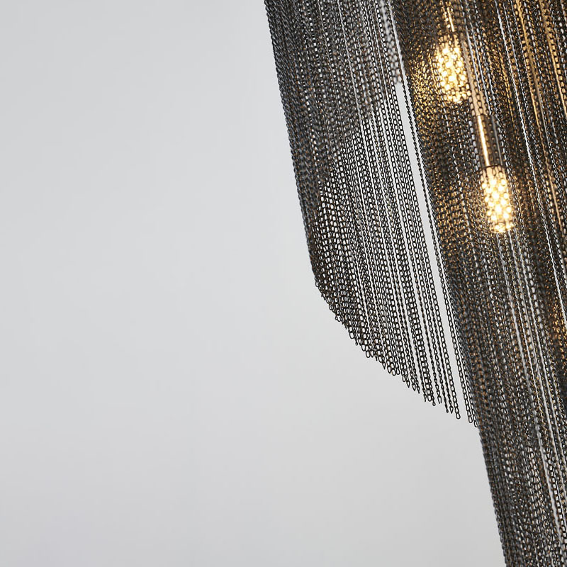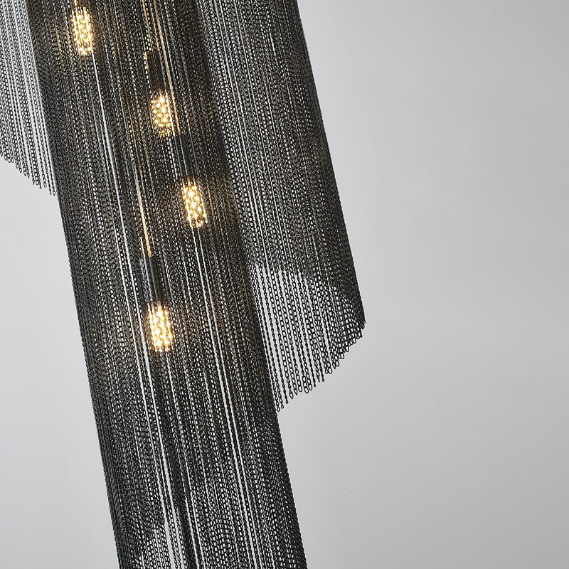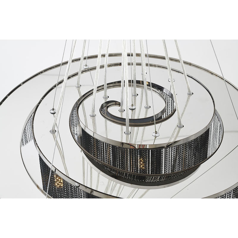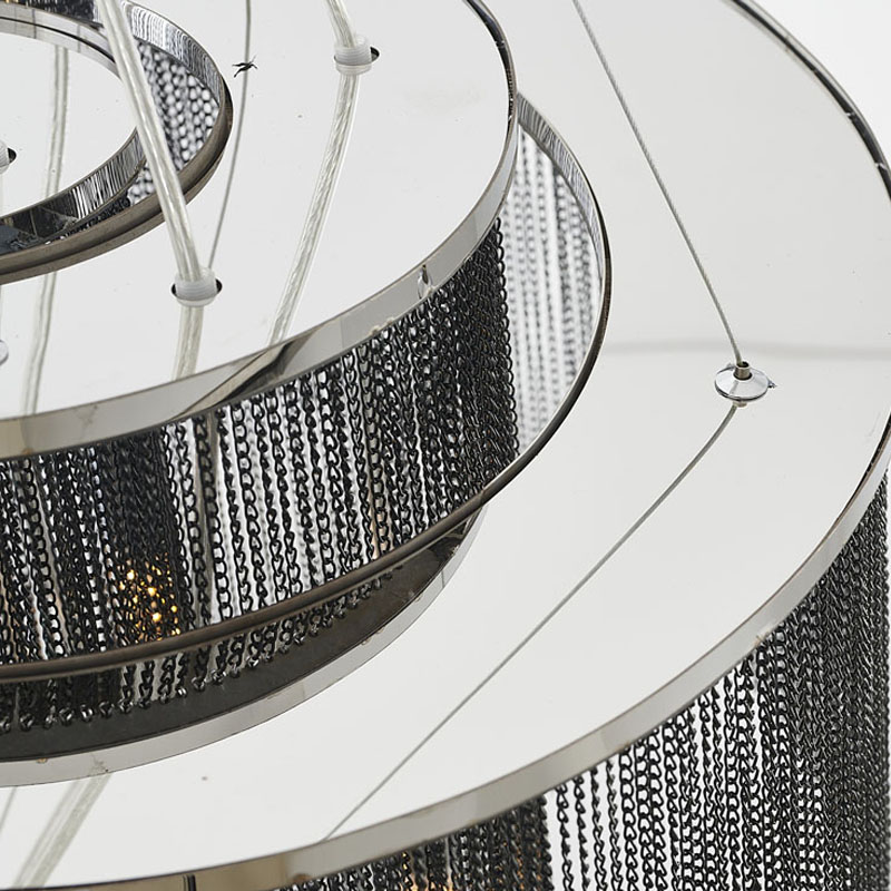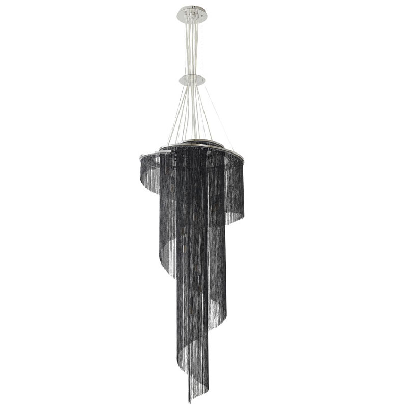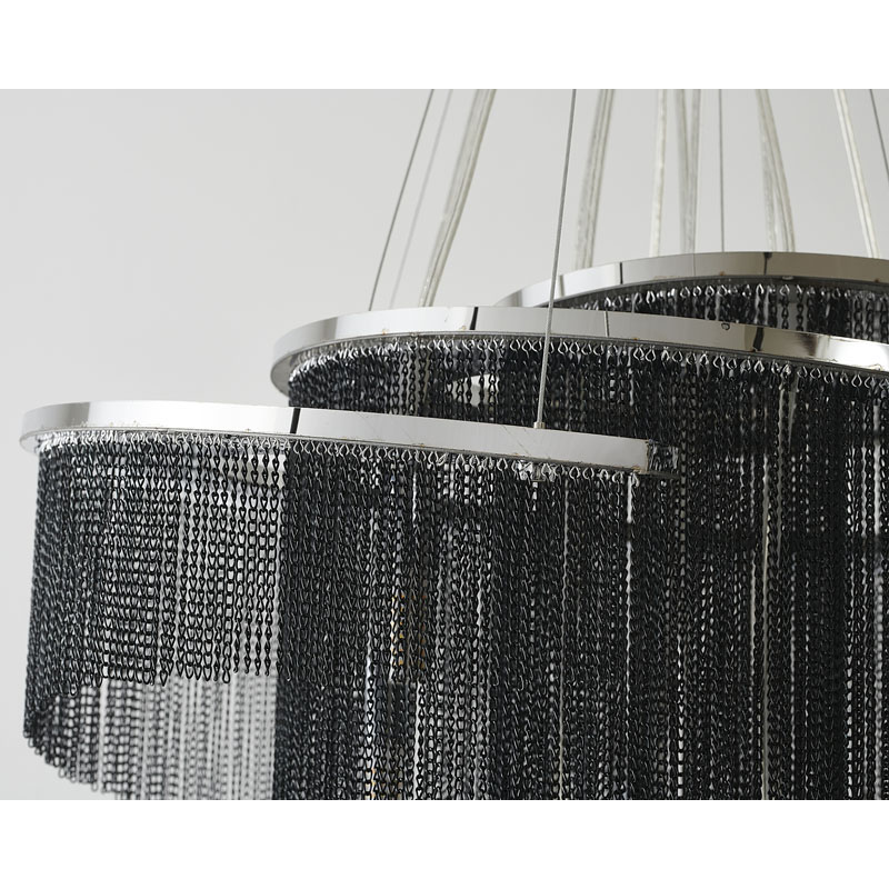 A BLACK STAINLESS STEEL CHAIN CHANDELIER WITH CHROME HARDWARE