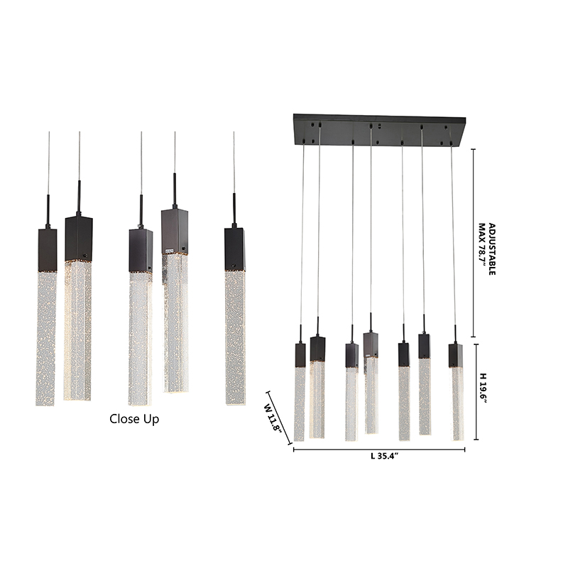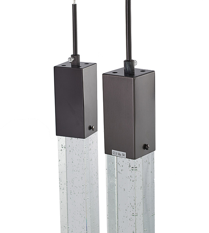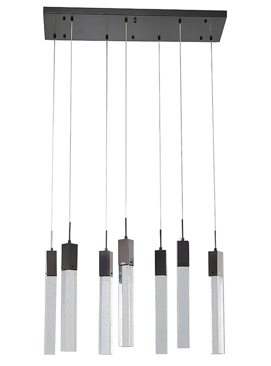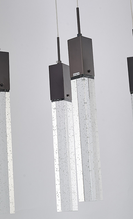 A BLACK GUN METAL FRAME ISLAND LIGHT WITH HANGING CLEAR BLOCK BUBBLE CRYSTALS