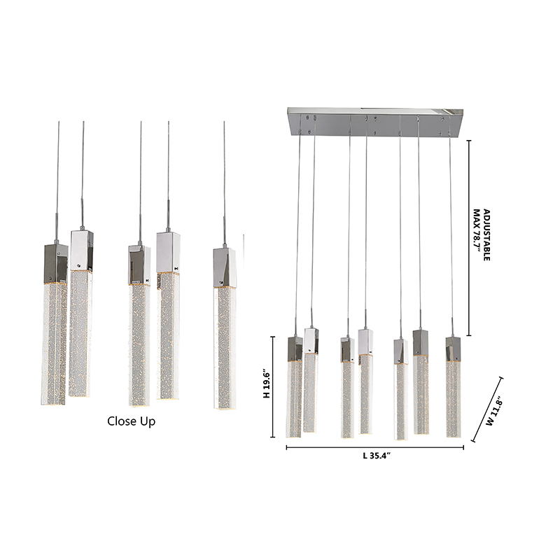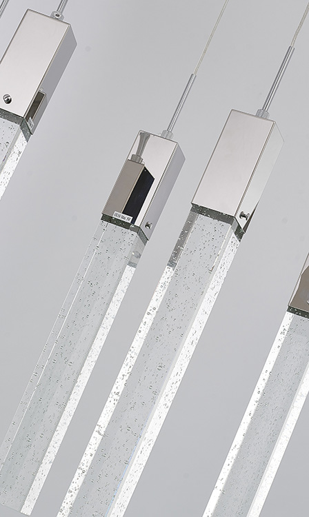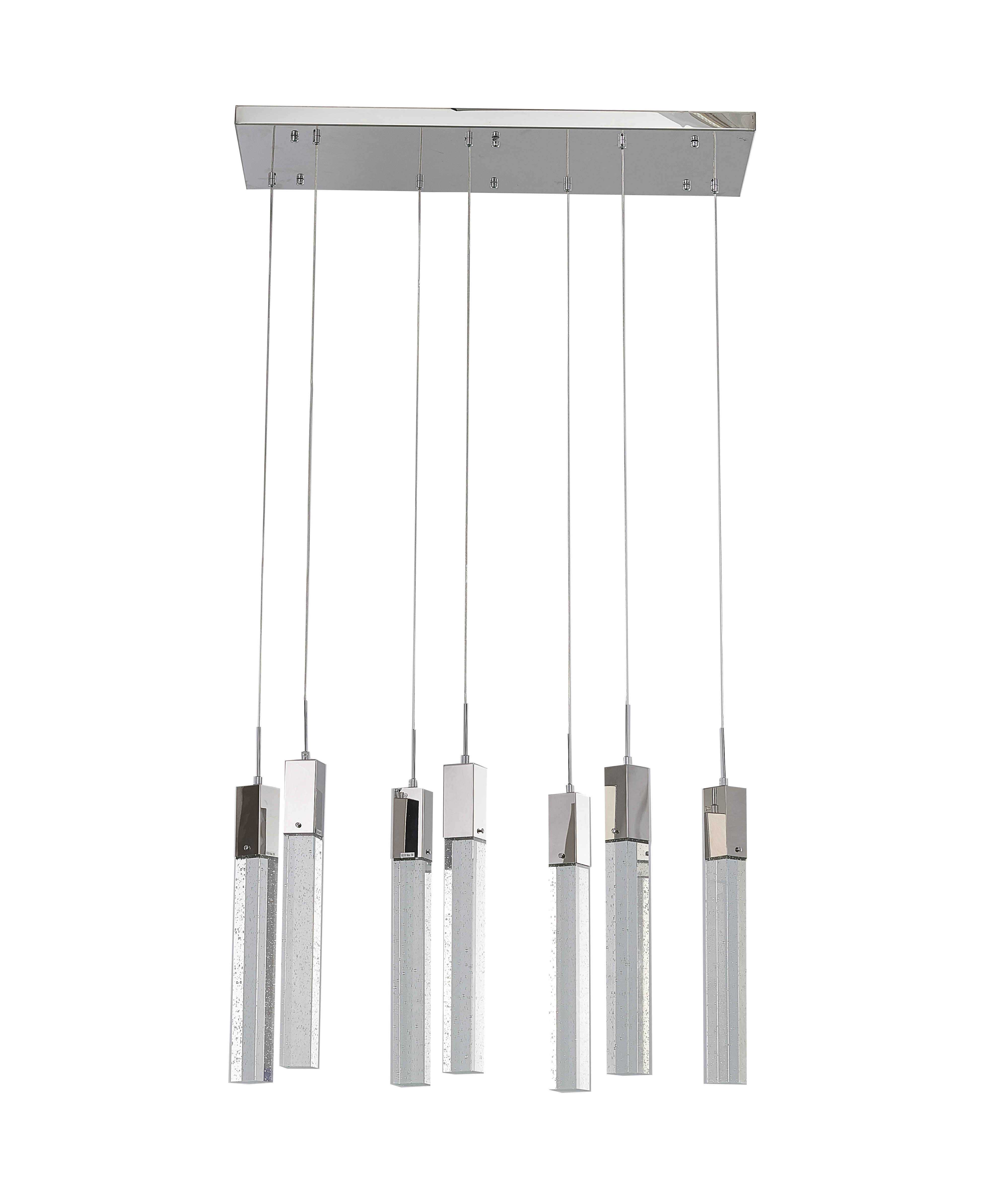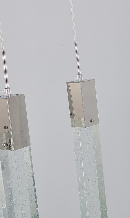 A CHROME FRAME ISLAND LIGHT WITH HANGING CLEAR BLOCK BUBBLE CRYSTALS