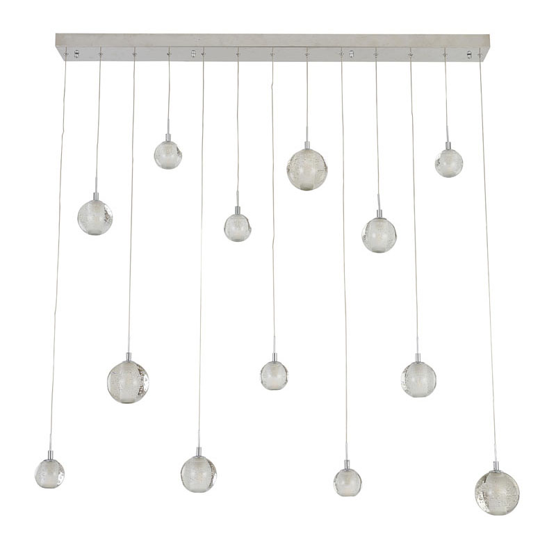 A RECTANGULAR CHROME FRAME CHANDELIER WITH HANGING CLEAR CRYSTAL BALL PENDANTS