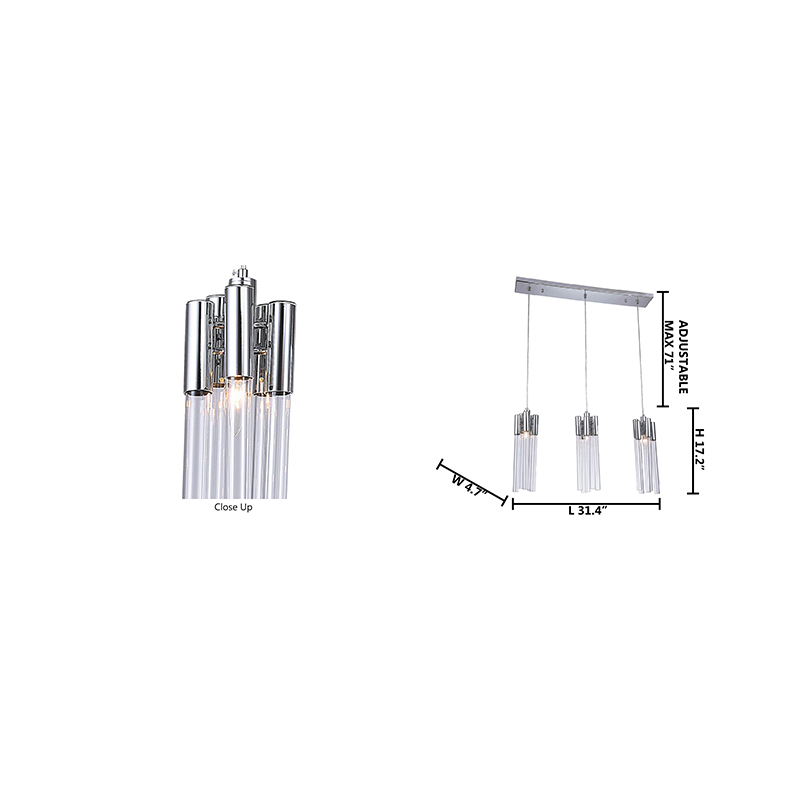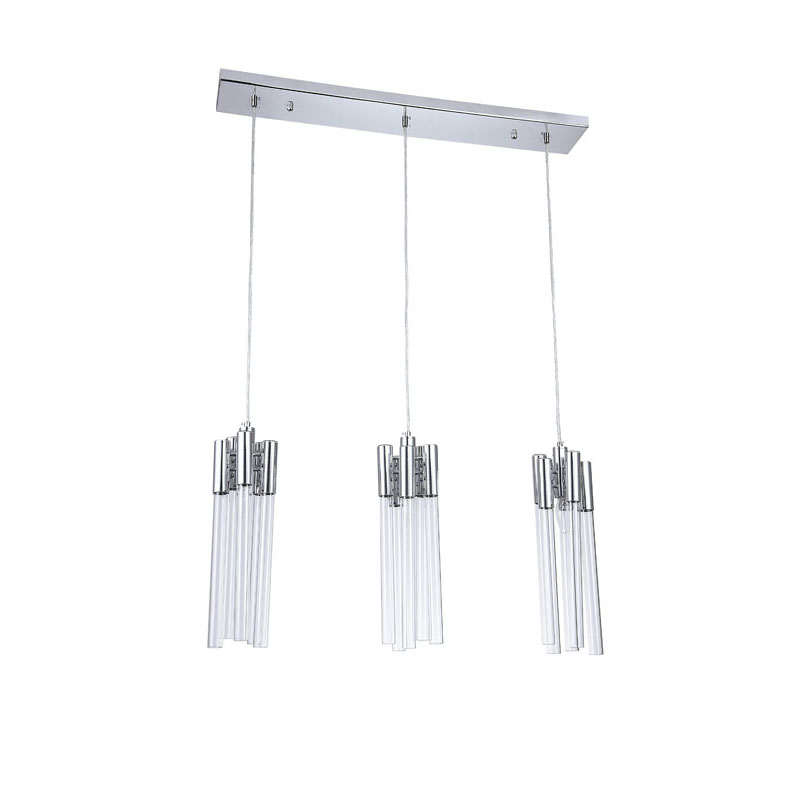 A CHROME FRAME THREE LIGHT PENDANT FIXTURE WITH CLEAR GLASS TUBING