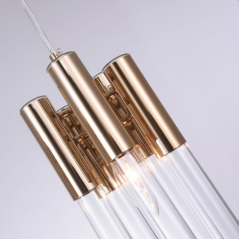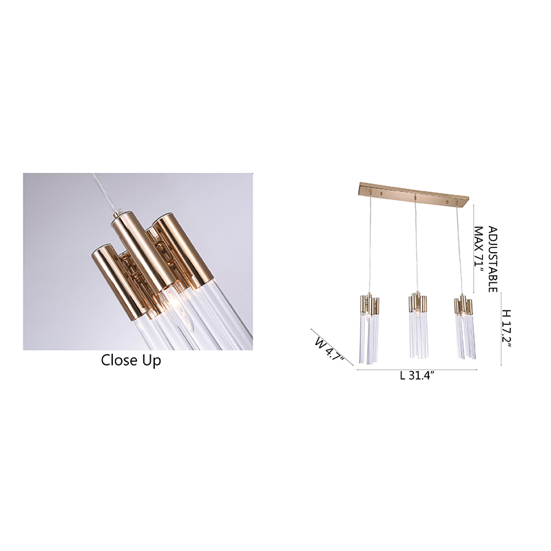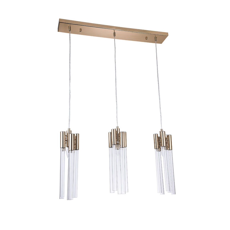 A GOLD FRAME THREE LIGHT PENDANT FIXTURE WITH CLEAR GLASS TUBING