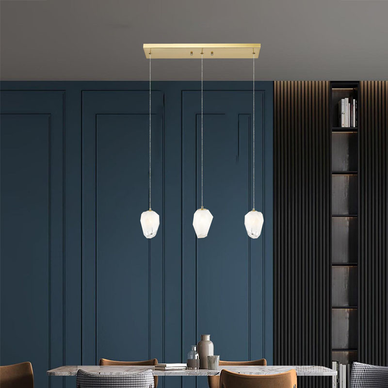 A GOLD FRAME ISLAND LIGHT WITH WHITE GLASS HANGING PENDANTS