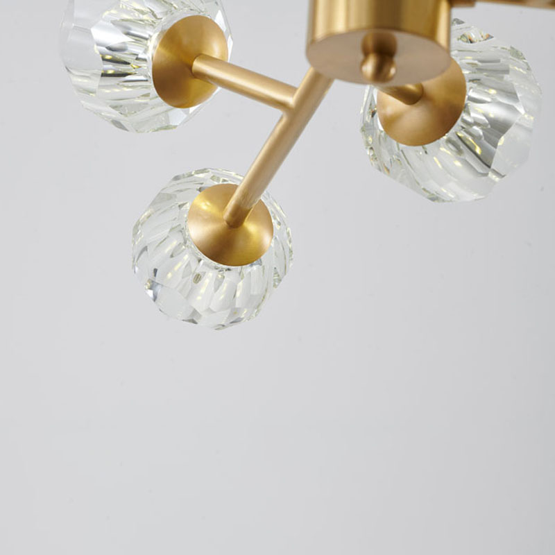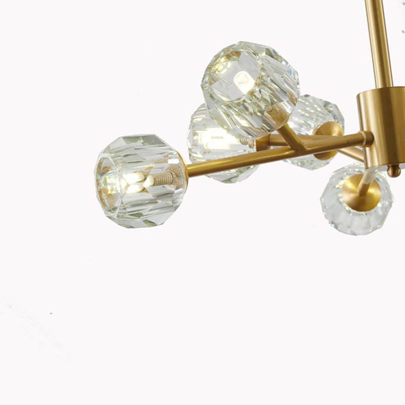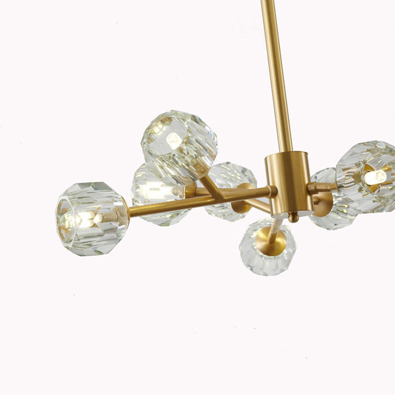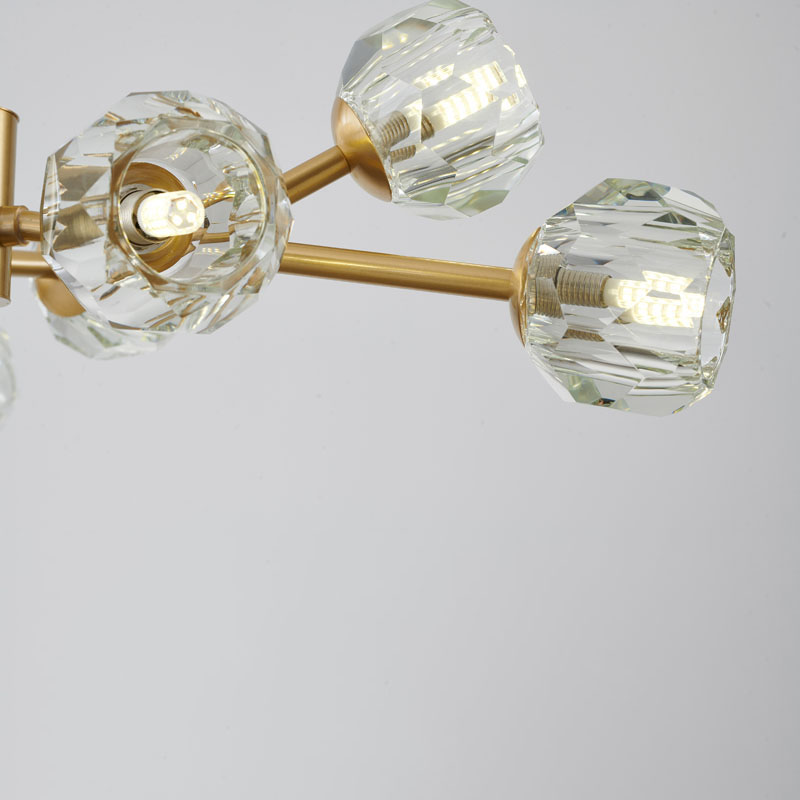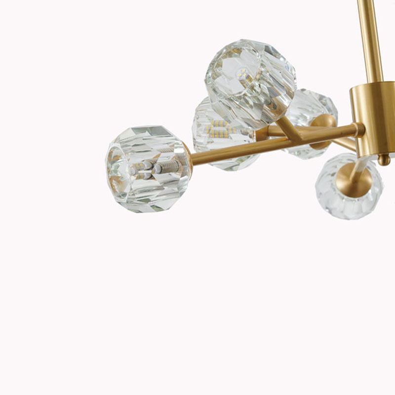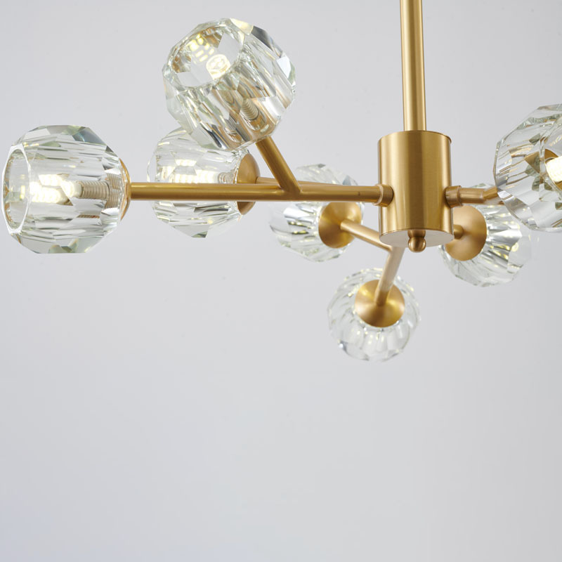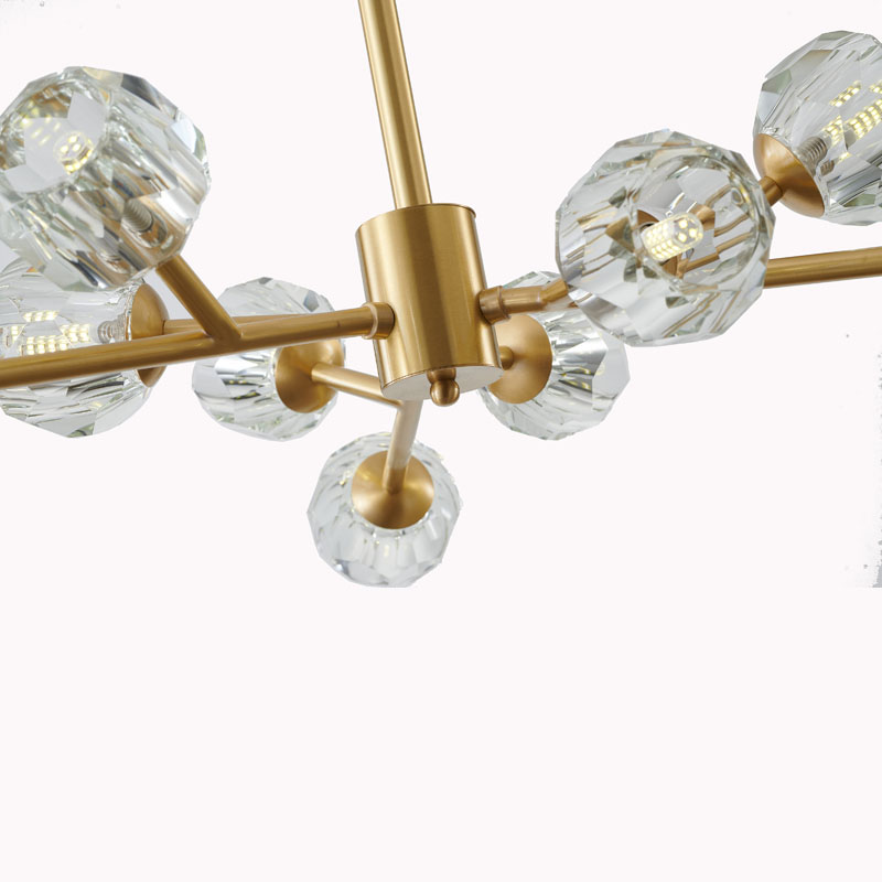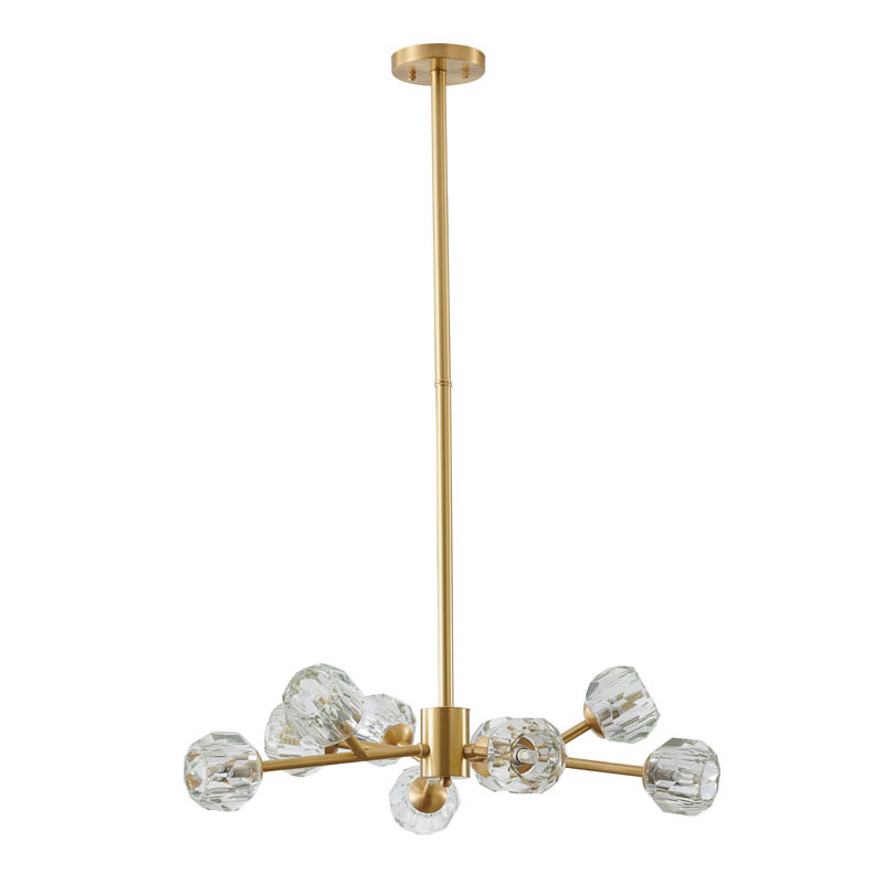 This transitional chandelier is a stunning addition to any room. With a diameter of 32 inches and a height of 18 inches, it's a substantial and impressive fixture that's perfect for illuminating in living room, bedroom, entryway, or foyer. The brass metal frame provides a warm and luxurious finish, while the clear crystal shade adds a touch of elegance and sophistication. The fixture is equipped with 9xG9 (Bulbs Not Included) that can accommodate a 40W, making it perfect for task lighting or general illumination. The adjustable rod link makes this fixture suitable for most ceiling heights