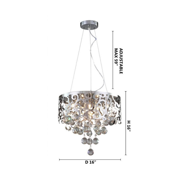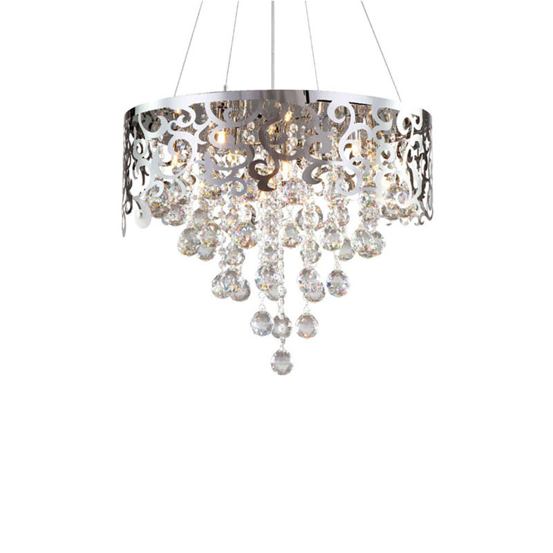 A CHROME LASER CUT CHANDELIER WITH CLEAR HANGING CRYSTAL BALLS