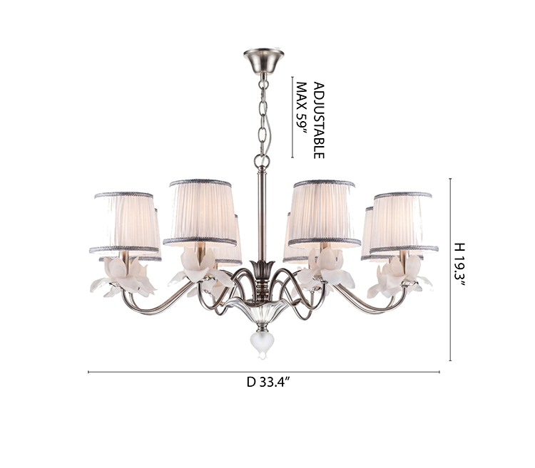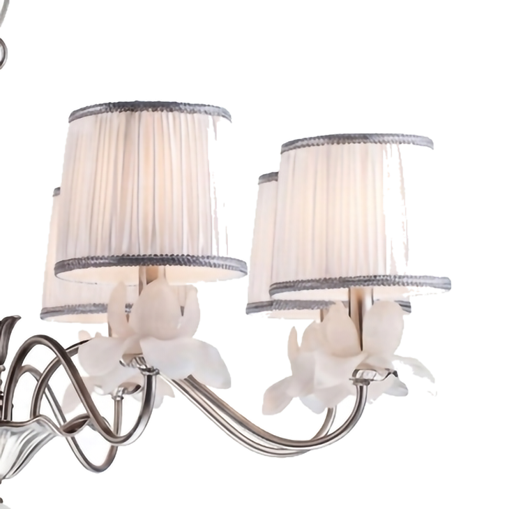 A SATIN NICKEL FRAME FLOWER CHANDELIER WITH A FABRIC WHITE SHADE