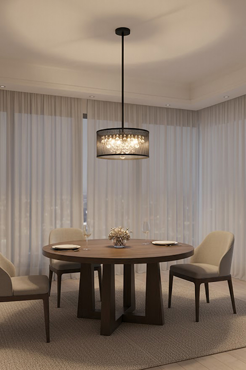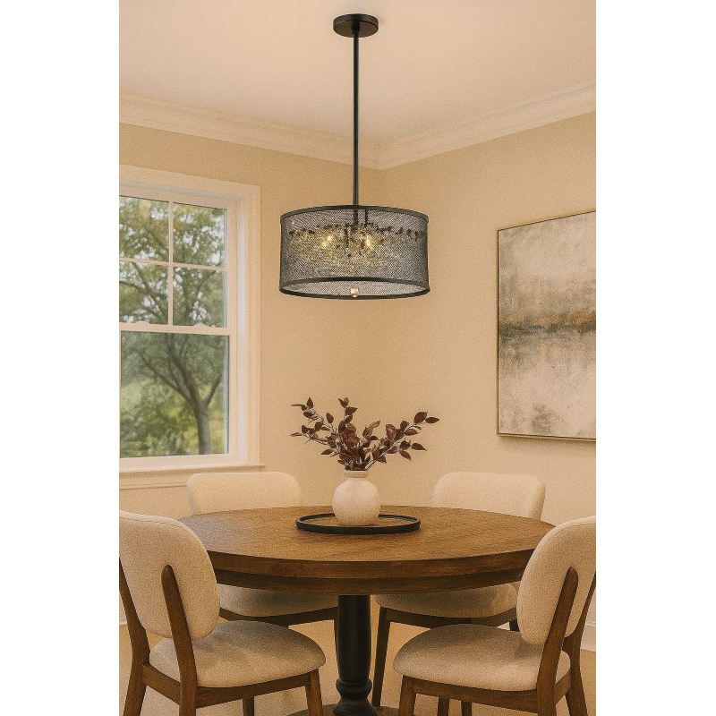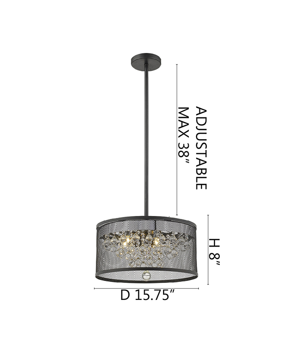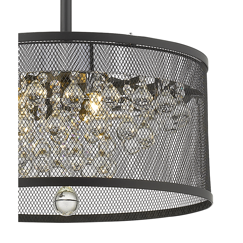 A BLACK METAL MESH FRAME CHANDELIER LIGHT WITH CHROME HARDWARE & CLEAR CRYSTAL HANGING BALLS