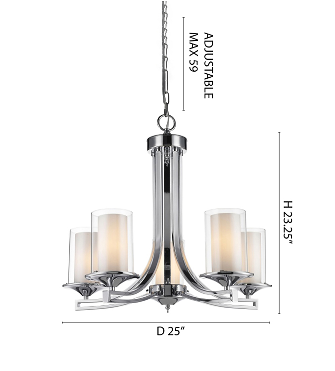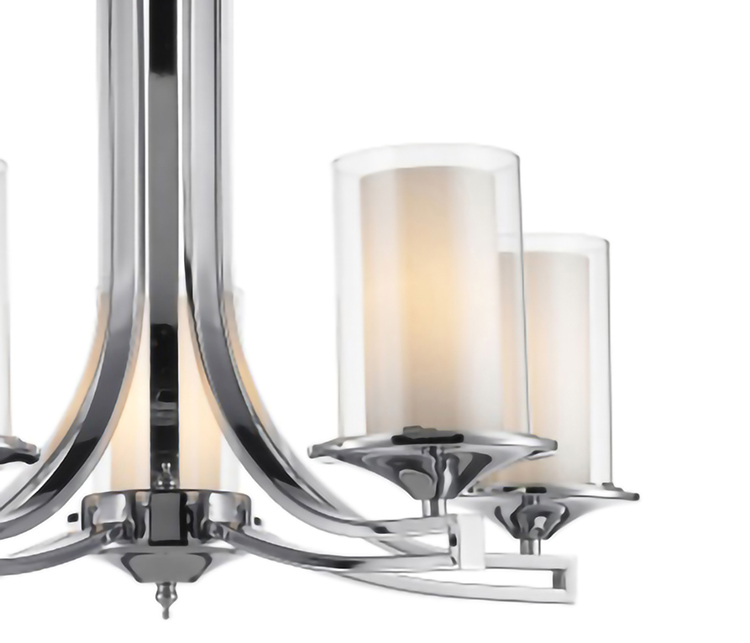 A CHROME FRAME CHANDELIER WITH CLEAR & WHITE CYLINDER GLASS SHADES