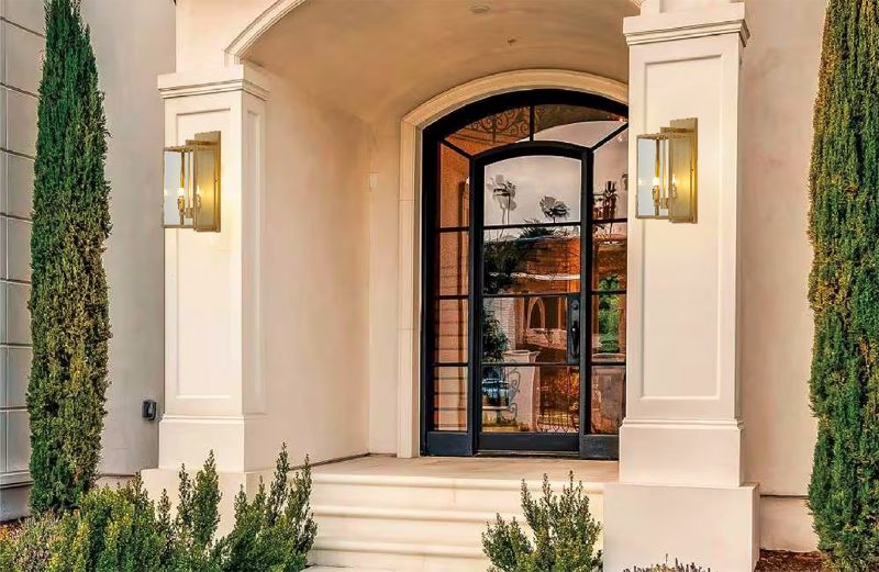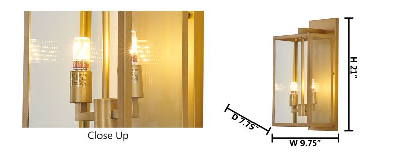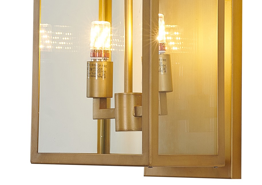 A BRASS COLOR OUTDOOR WALL SCONCE WITH A CLEAR GLASS SHADE