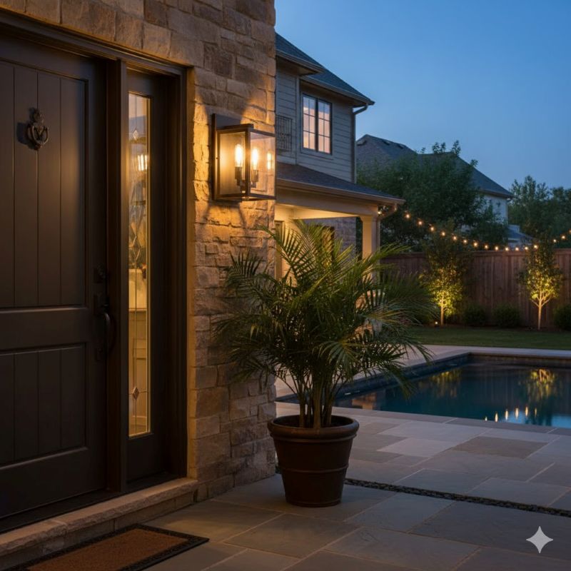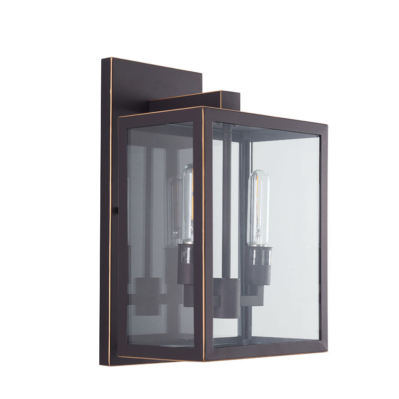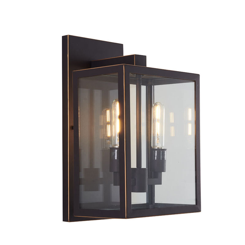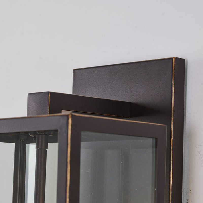 AN OIL BRONZED BLACK FRAMED OUTDOOR WALL SCONCE WITH GOLD EDGES AND CLEAR GLASS