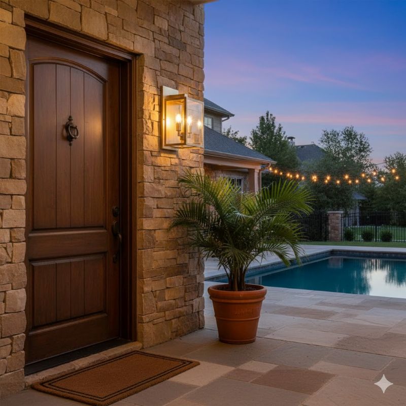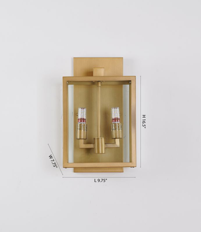 A BRASS COLOR OUTDOOR WALL SCONCE LIGHT WITH A CLEAR GLASS SHADE