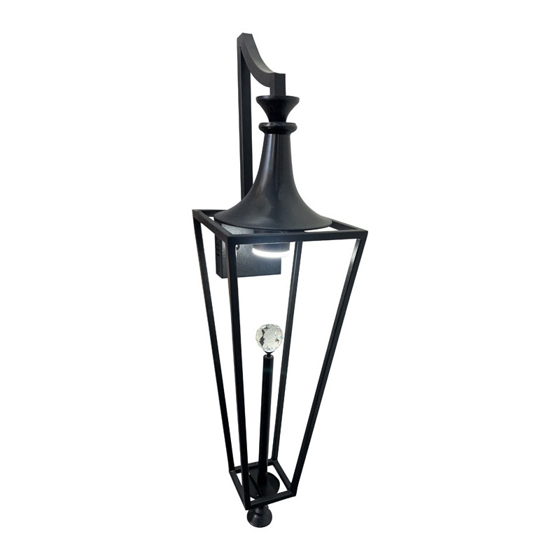 A BLACK OUTDOOR WALL SCONCE WITH A CLEAR CRYSTAL BALL ACCENT