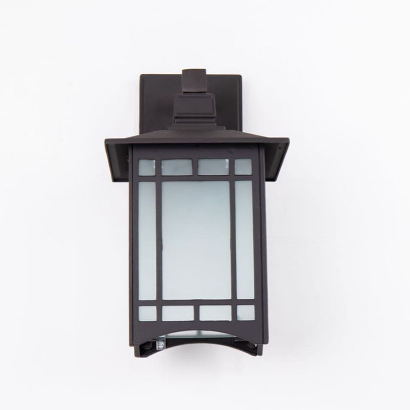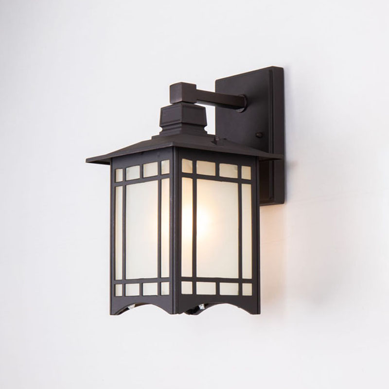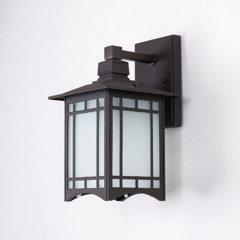 AN OUTDOOR WALL SCONCE IN A OLD BRONZE COLORED FRAME WITH A FROSTED GLASS SHADE