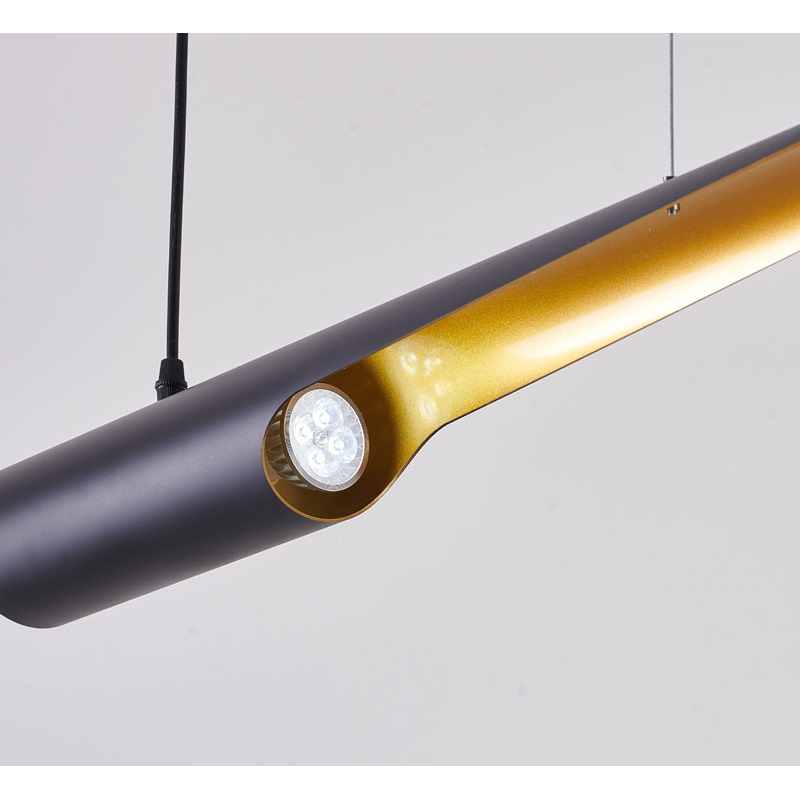 A BLACK TUBED PENDANT LIGHT FIXTURE WITH A GOLD INTERIOR