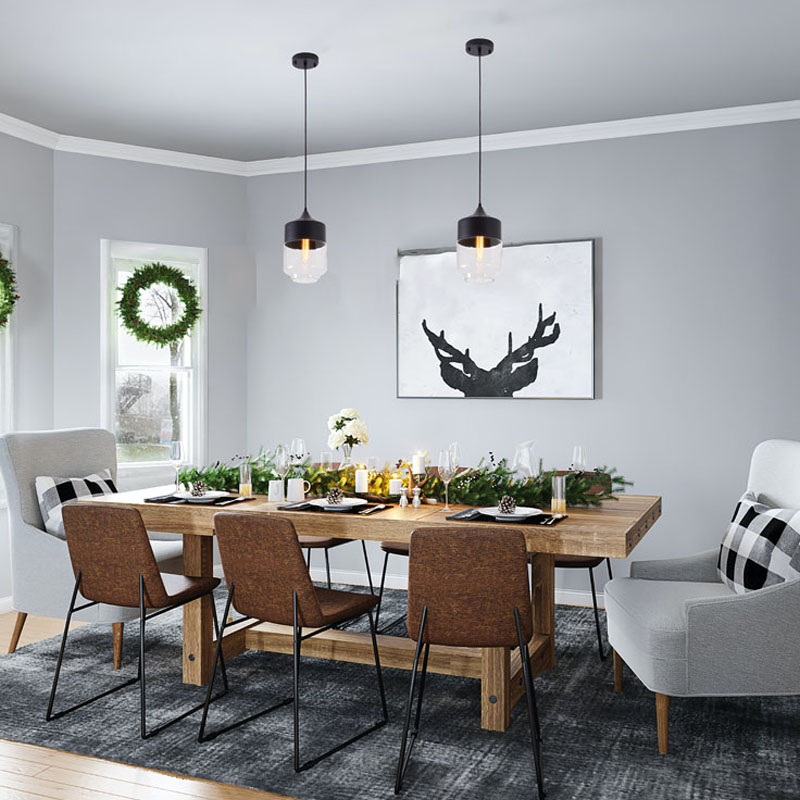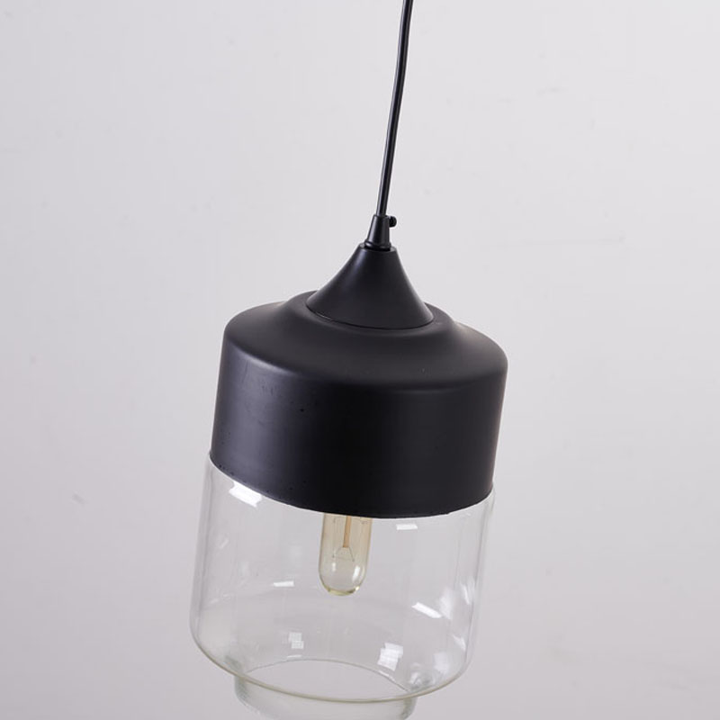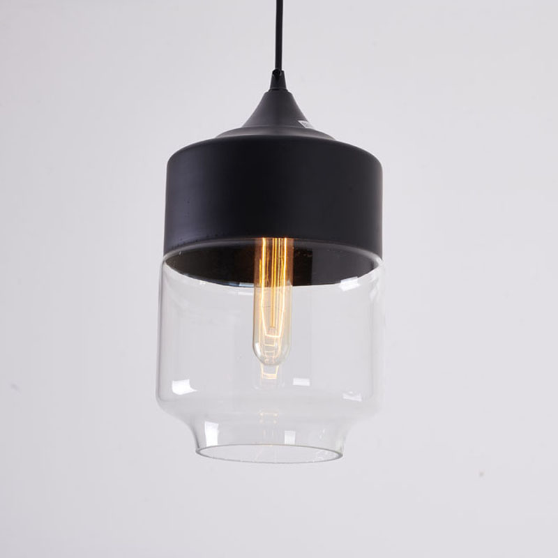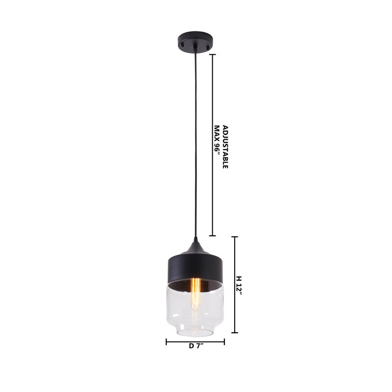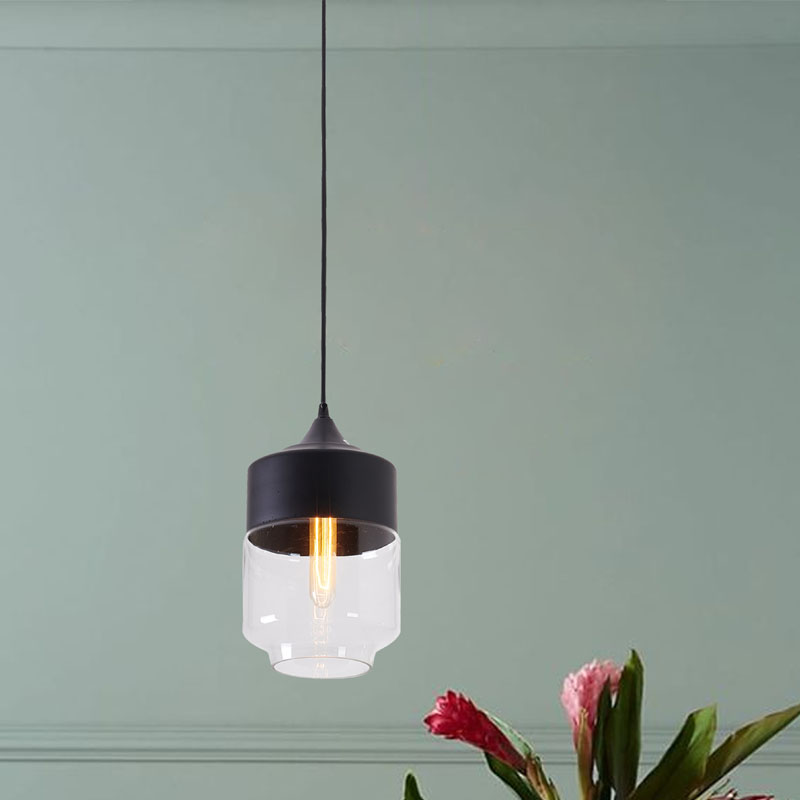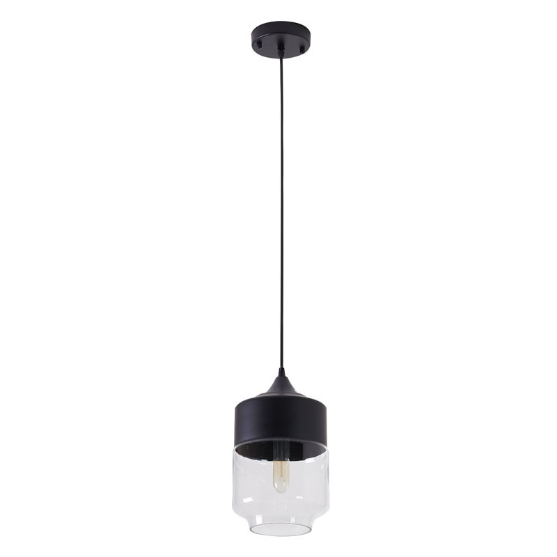 A BLACK FRAME SINGLE PENDANT LIGHT WITH A CLEAR GLASS SHADE