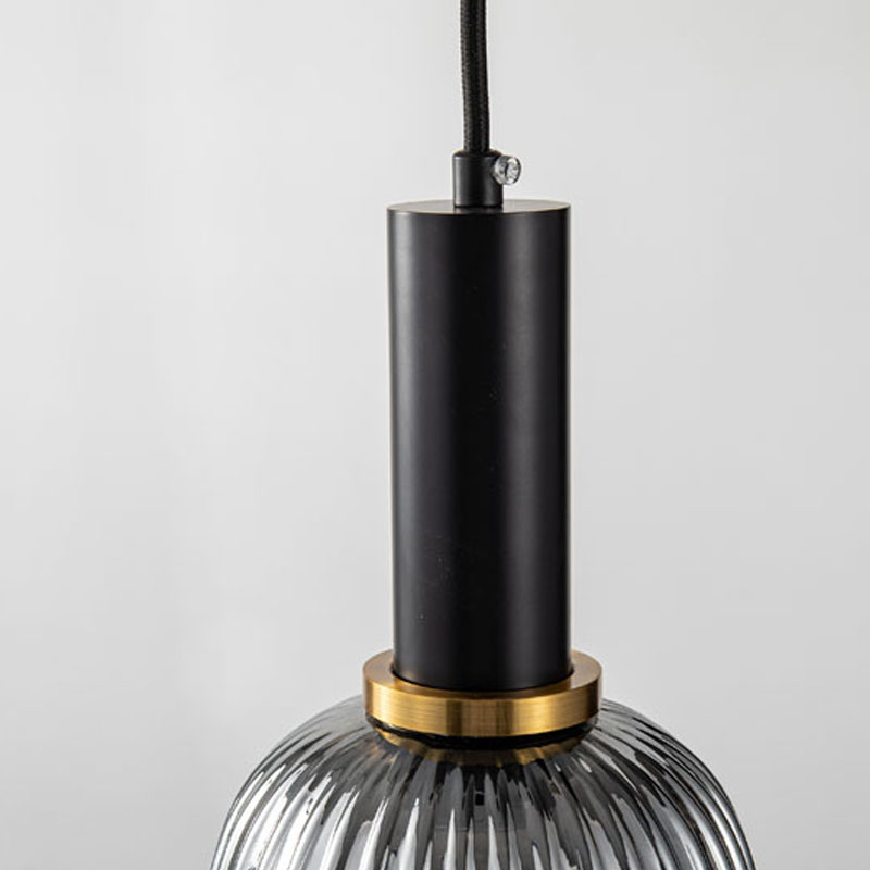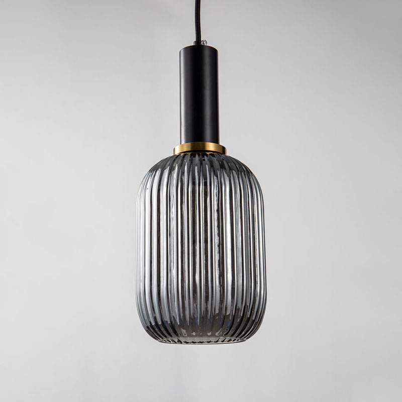 A SMOKE SHADE SINGLE PENDANT LIGHT WITH BLACK & ANTIQUE GOLD HARDWARE