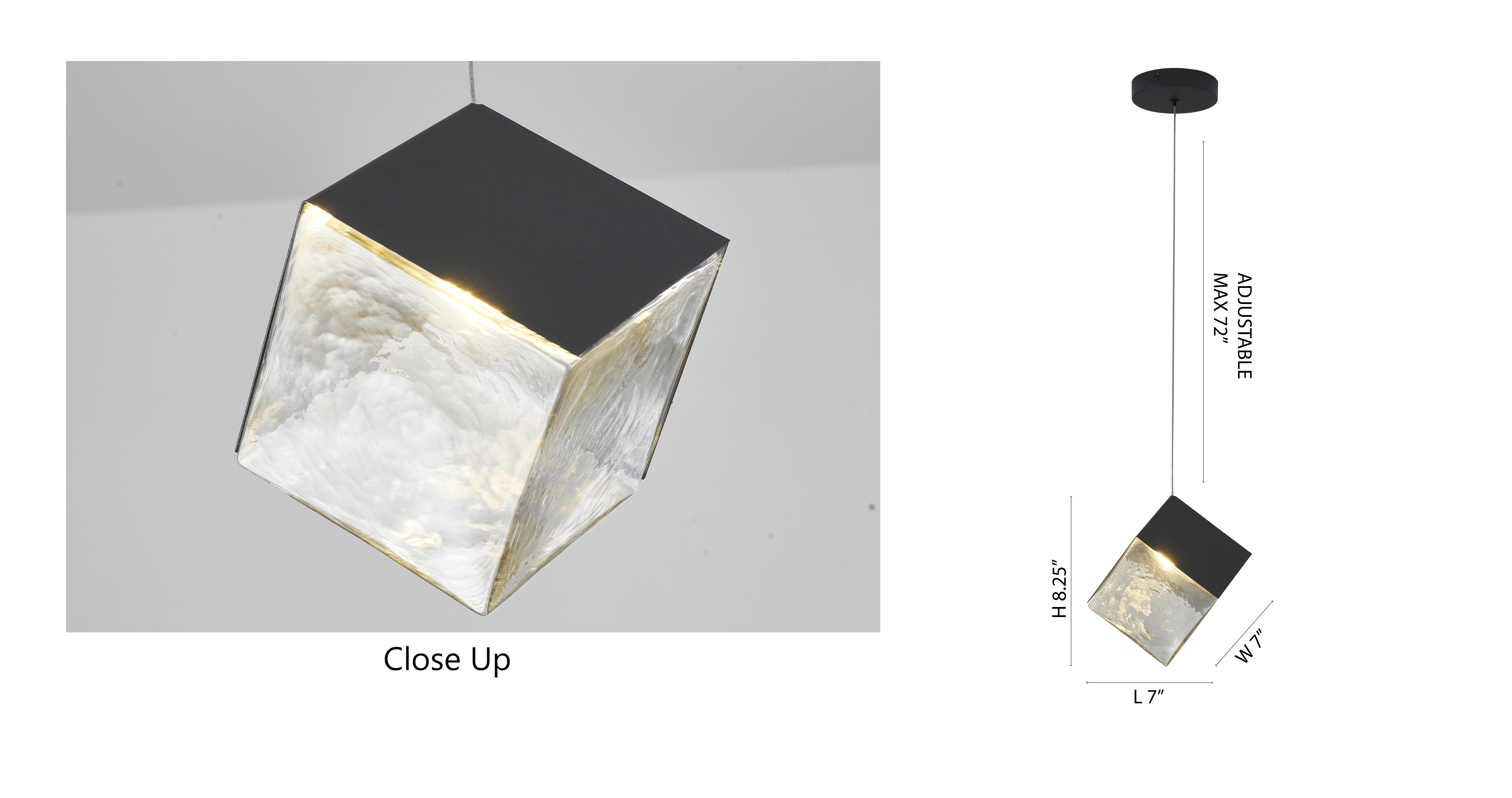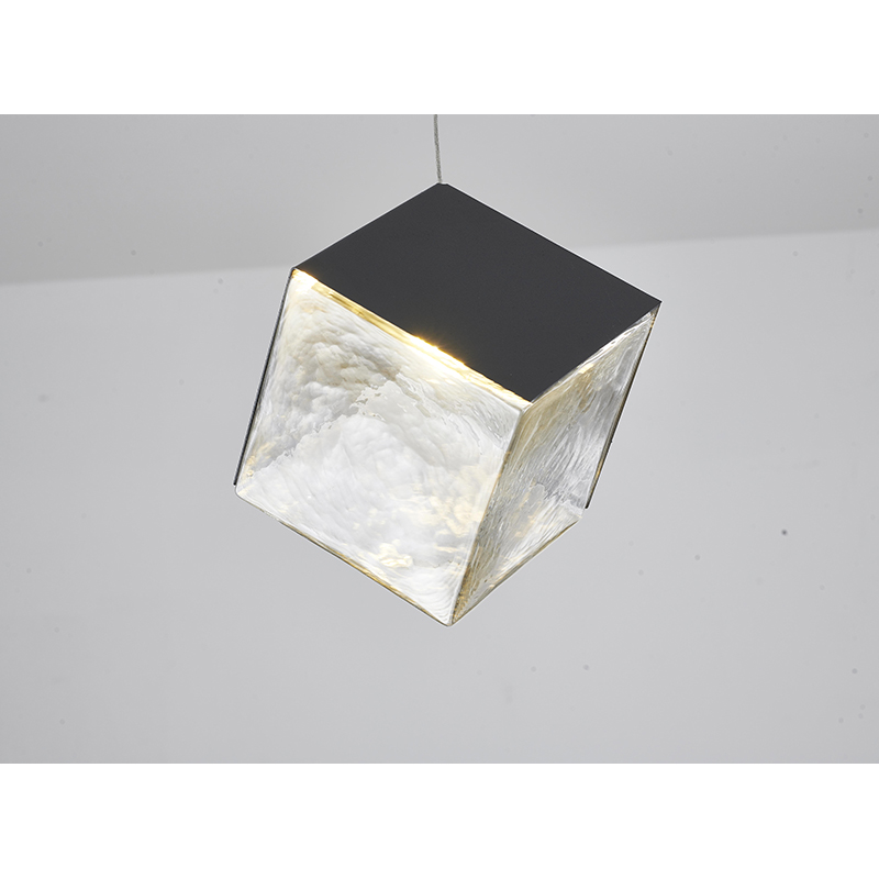 A BLACK FRAME CUBED PENDANT LIGHT WITH CLEAR DISTORTED GLASS
