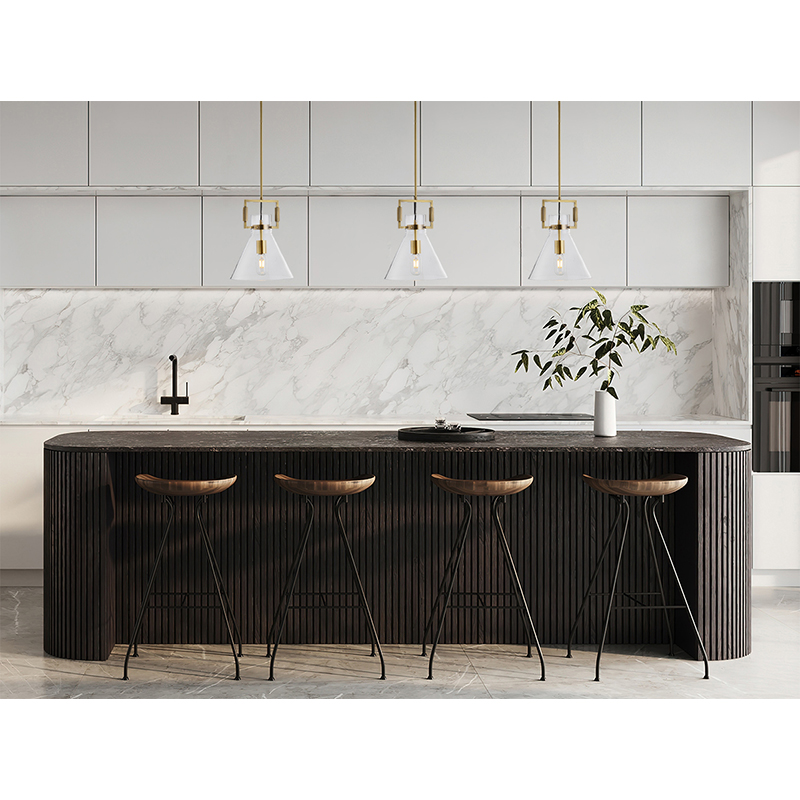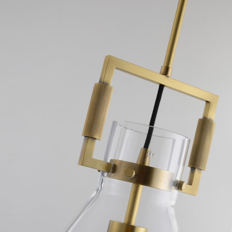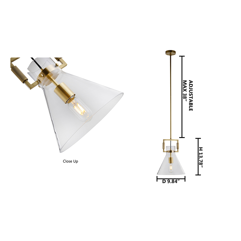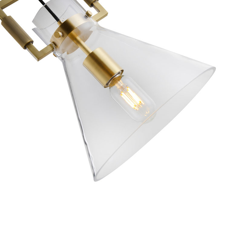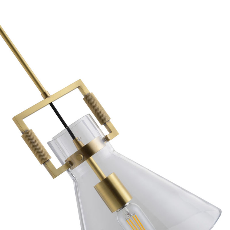 A BRASS METAL FRAME SINGLE PENDANT LIGHT WITH A CLEAR GLASS CONE SHADE