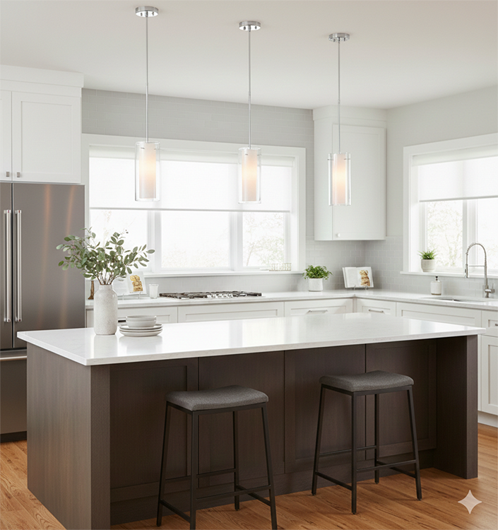 A CLEAR AND WHITE CYLINDER GLASS PENDANT LIGHT WITH CHROME HARDWARE