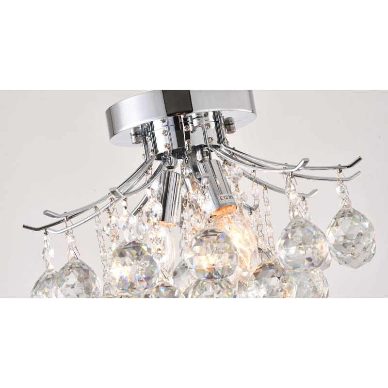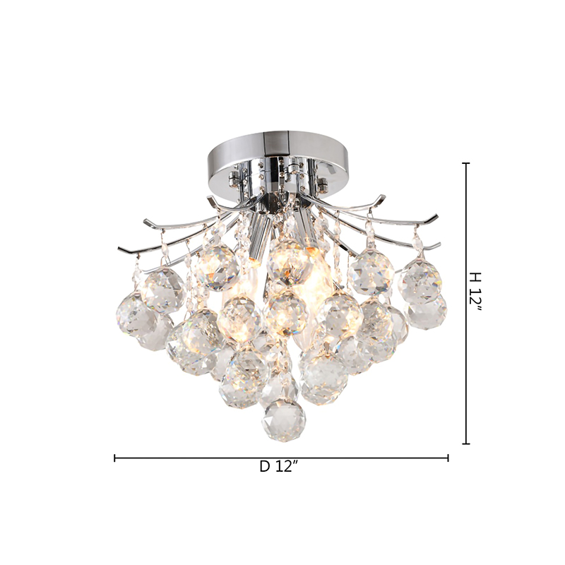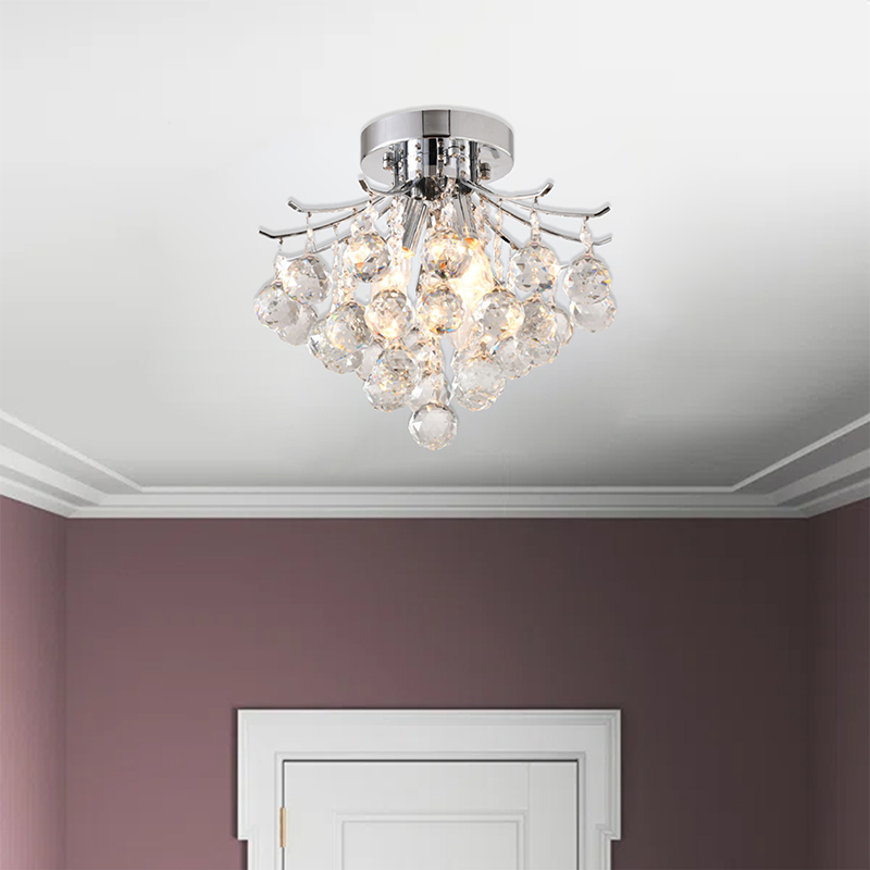 A CHROME FRAMED SEMI FLUSH MOUNT WITH CLEAR HANGING CRYSTAL BALLS