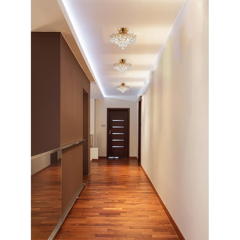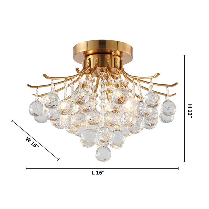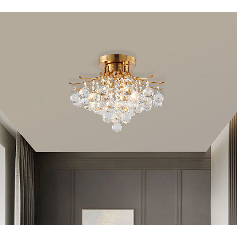 A SATIN BRASS FRAME SEMI FLUSH MOUNT WITH CLEAR HANGING CRYSTALS