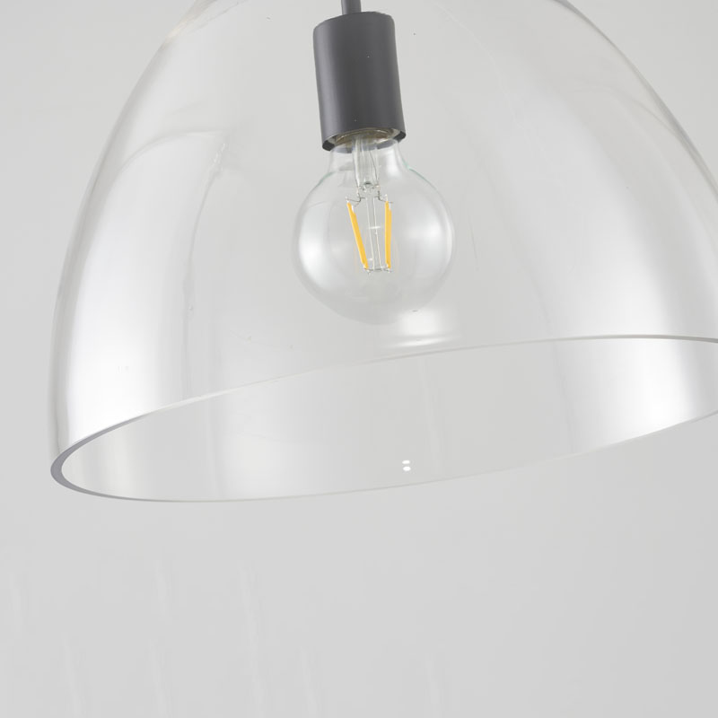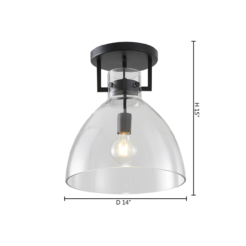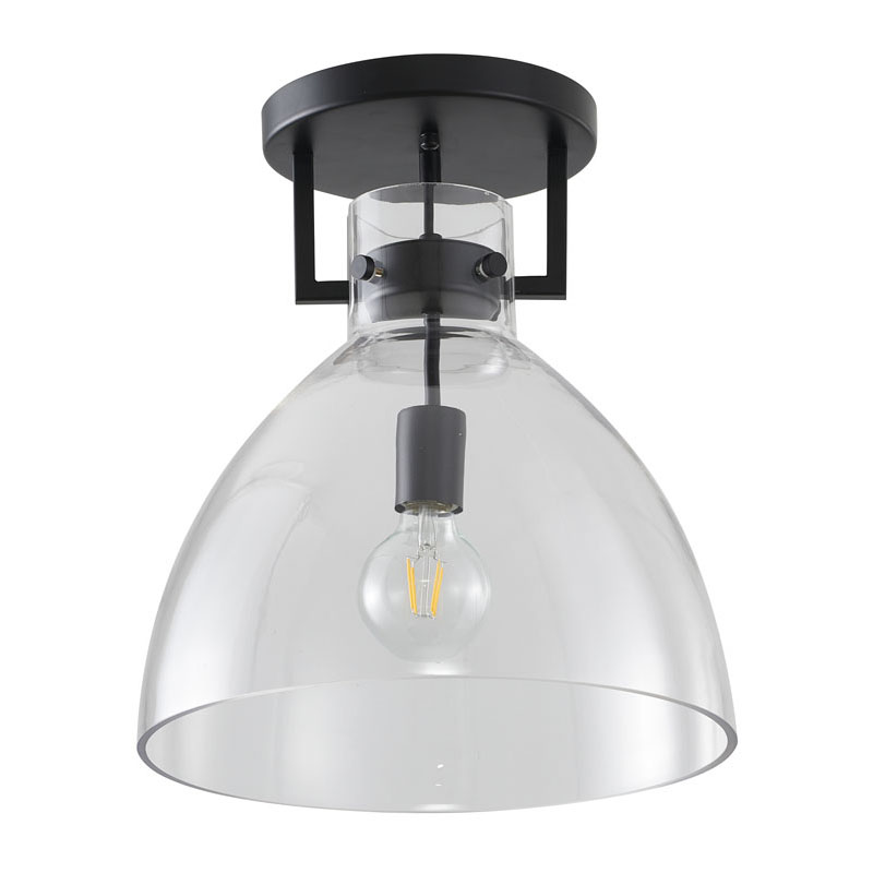 A BLACK METAL FRAME SEMI FLUSH MOUNT WITH A CLEAR GLASS SHADE