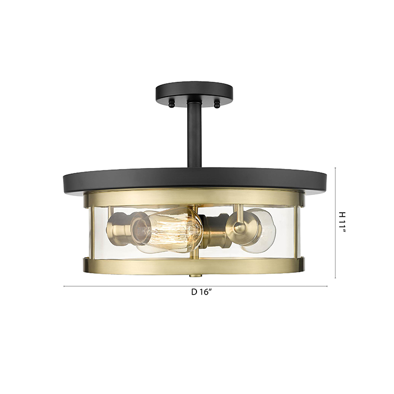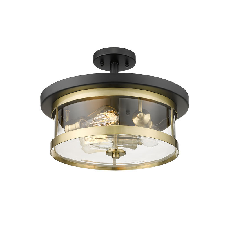 A BLACK & GOLD ROUND SEMI FLUSH MOUNT WITH A CLEAR GLASS SHADE