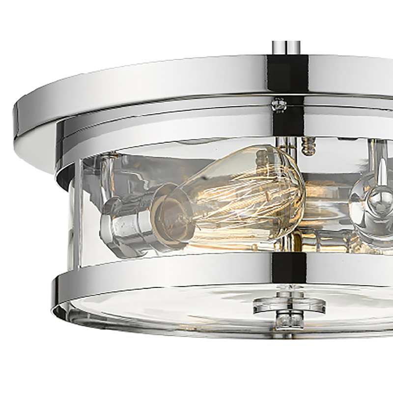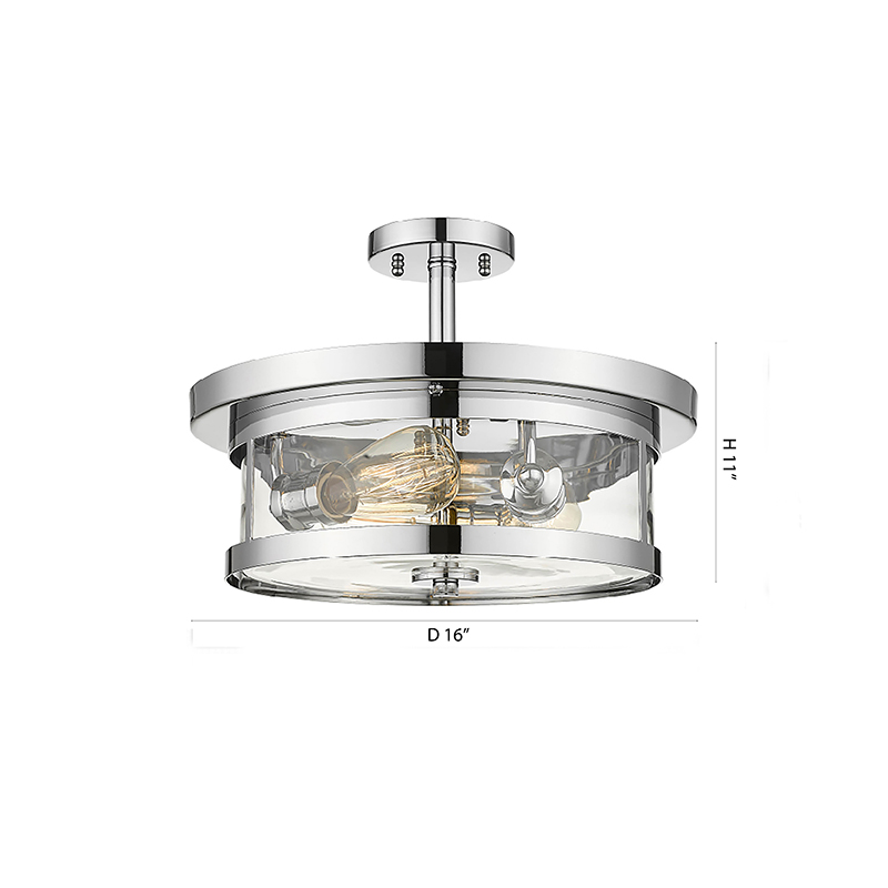 A CHROME ROUND SEMI FLUSH MOUNT WITH A CLEAR GLASS SHADE