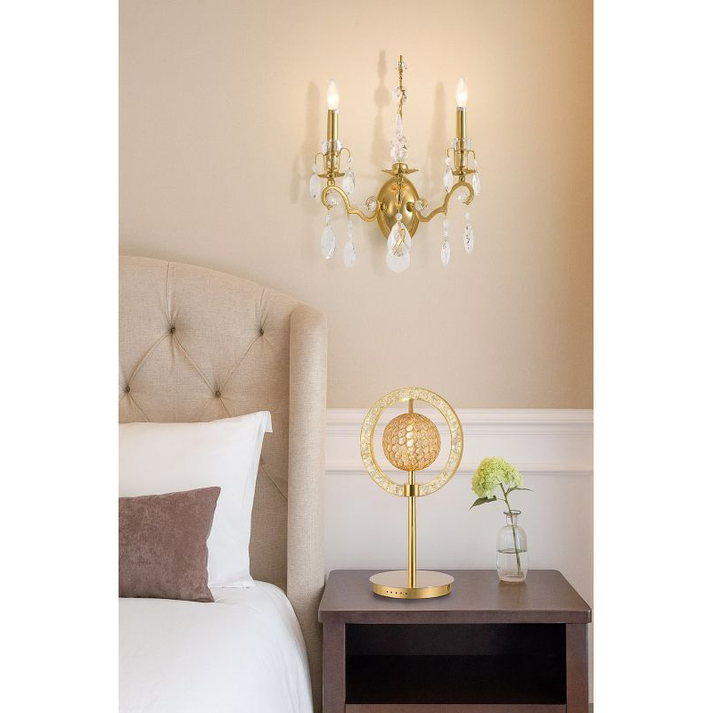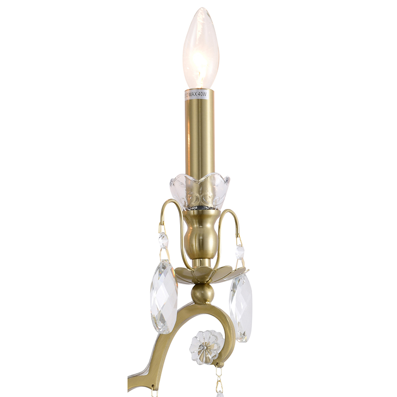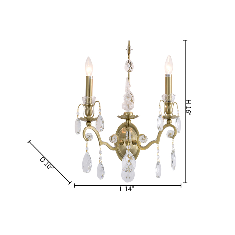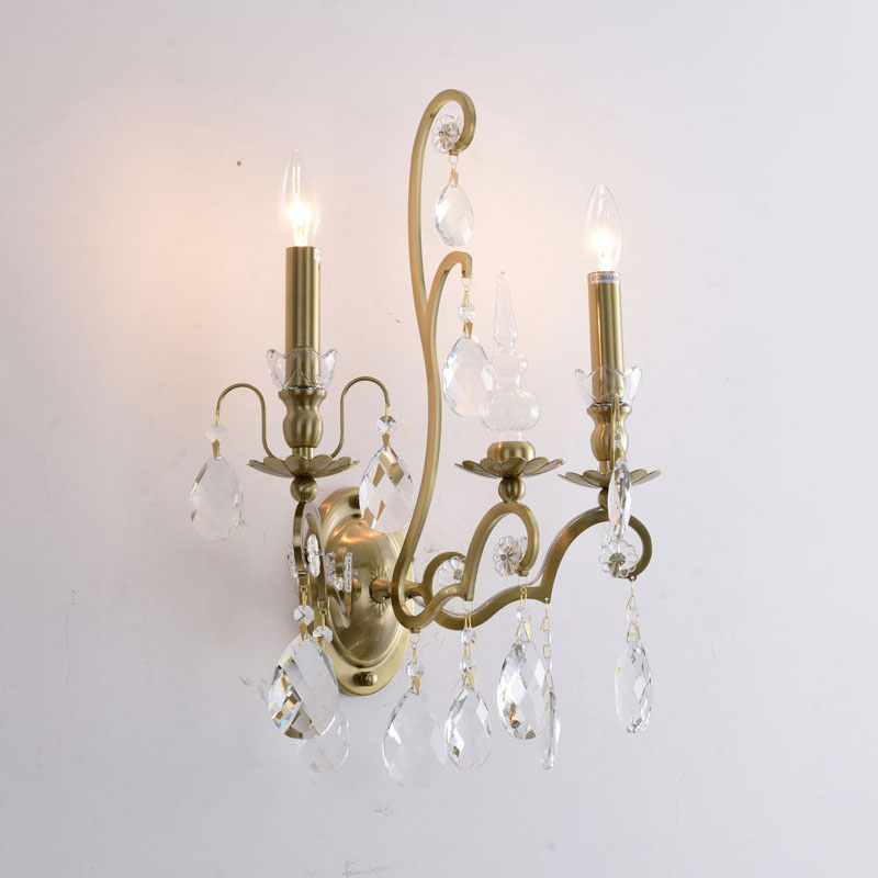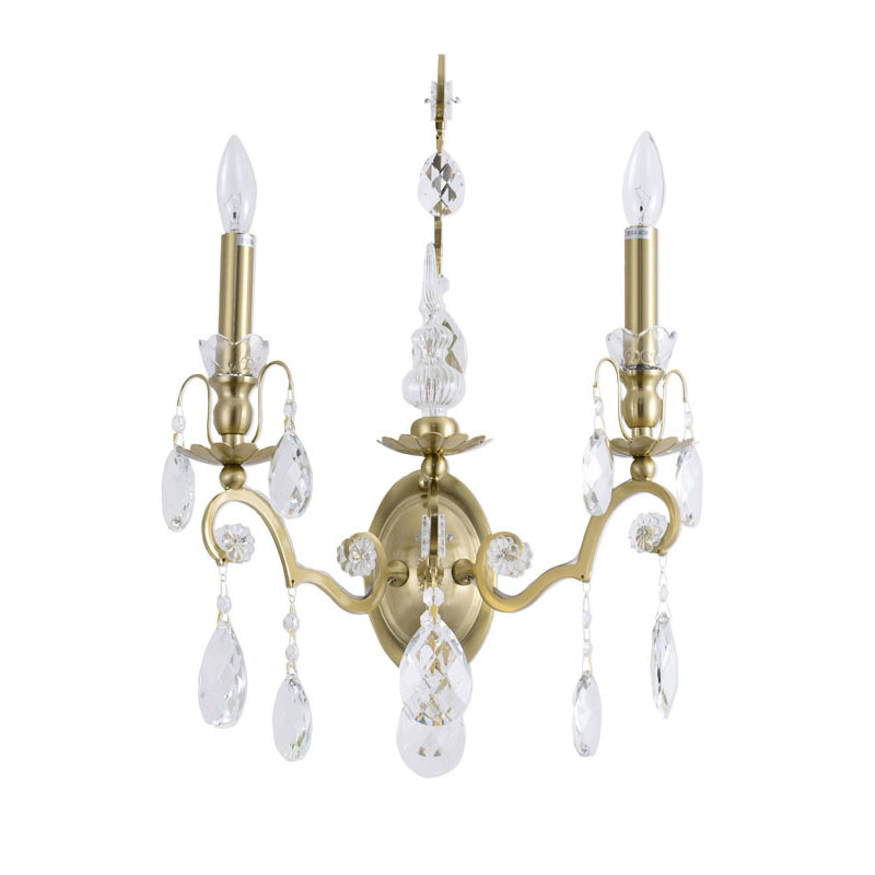 A TWO LIGHT BRASS WALL SCONCE WITH CLEAR HANGING CRYSTALS