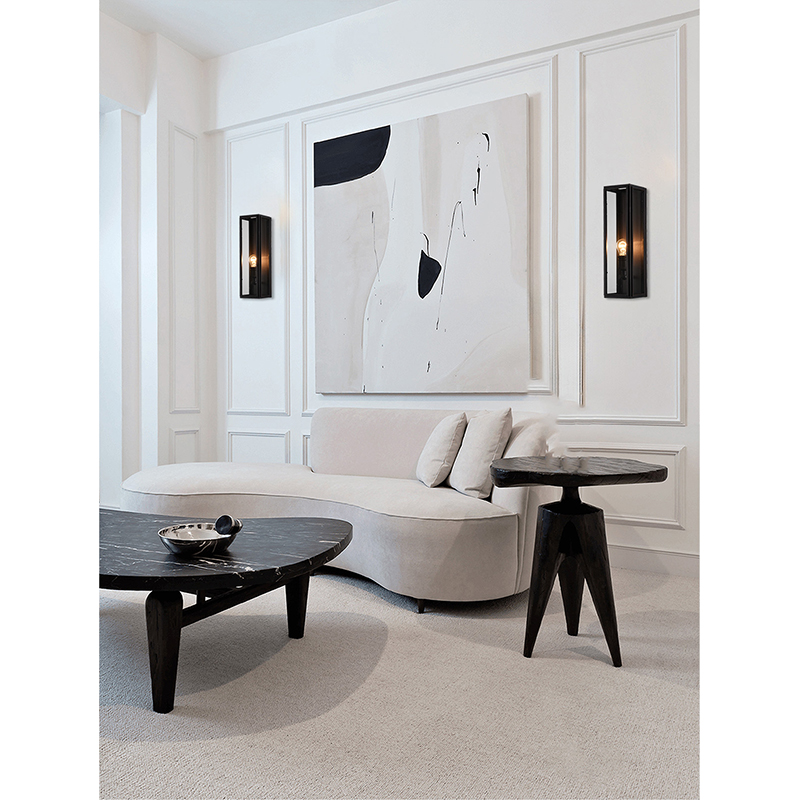 A BLACK RECTANGULAR FRAME WALL SCONCE WITH A CLEAR GLASS SHADE