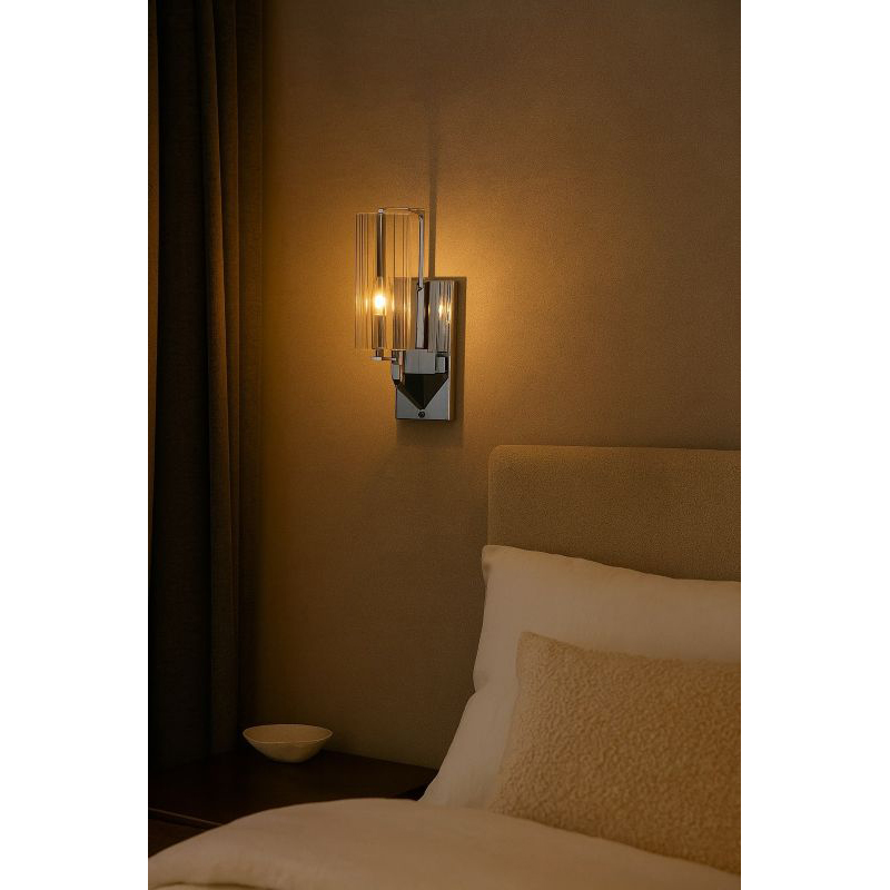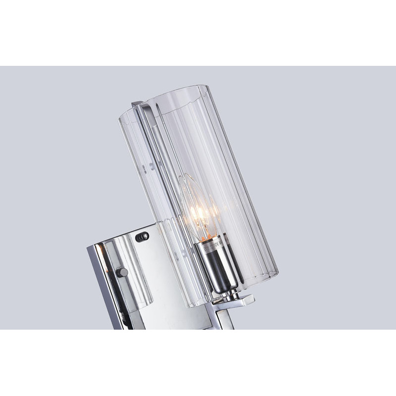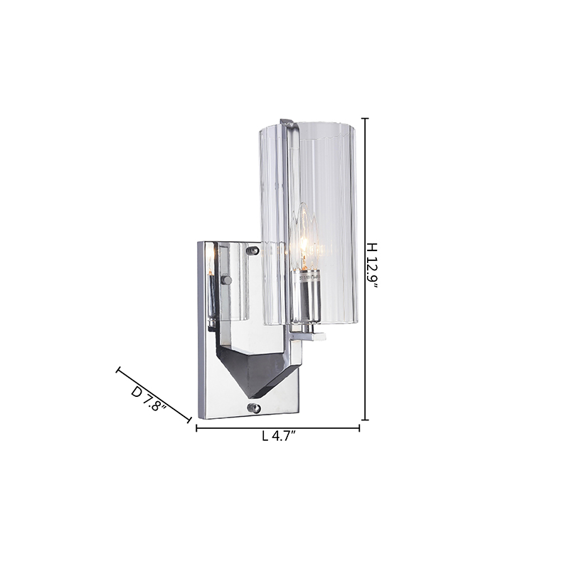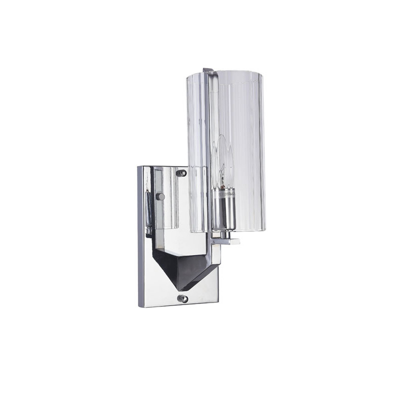 A CHROME FRAME SINGLE LIGHT WALL SCONCE WITH A CLEAR GLASS CYLINDER SHADE