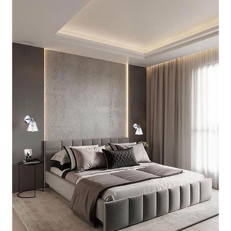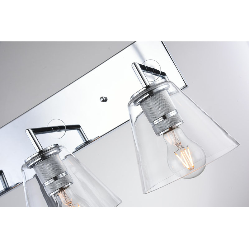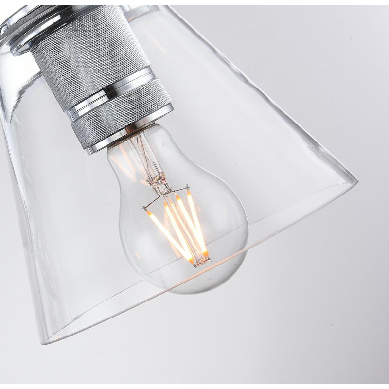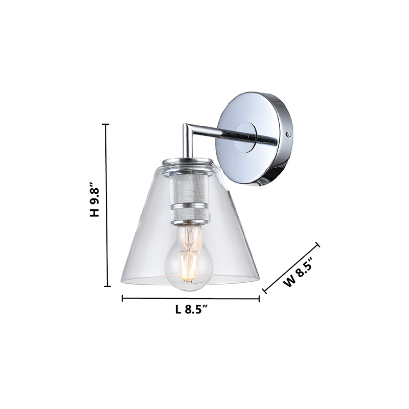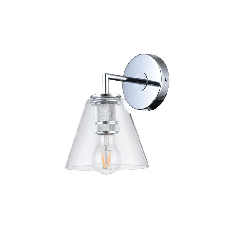 A CHROME METAL FRAME WALL SCONCE WITH A CLEAR GLASS CONE SHADE