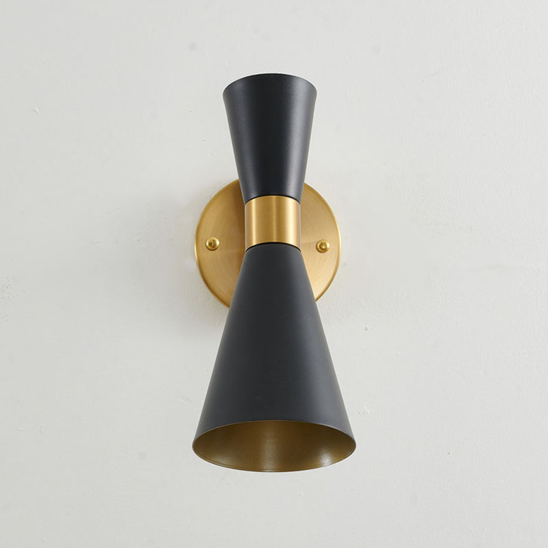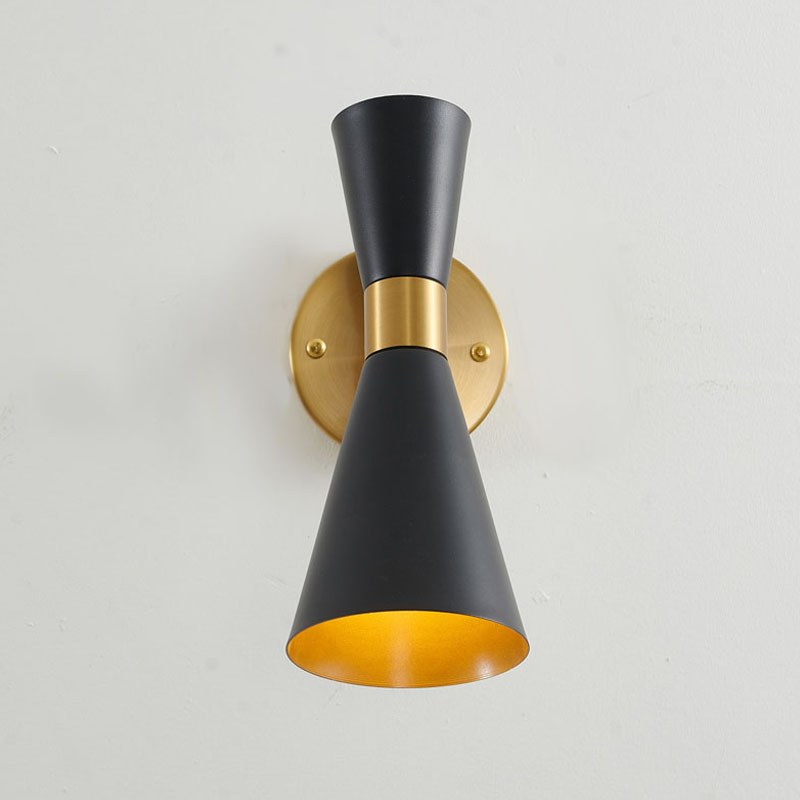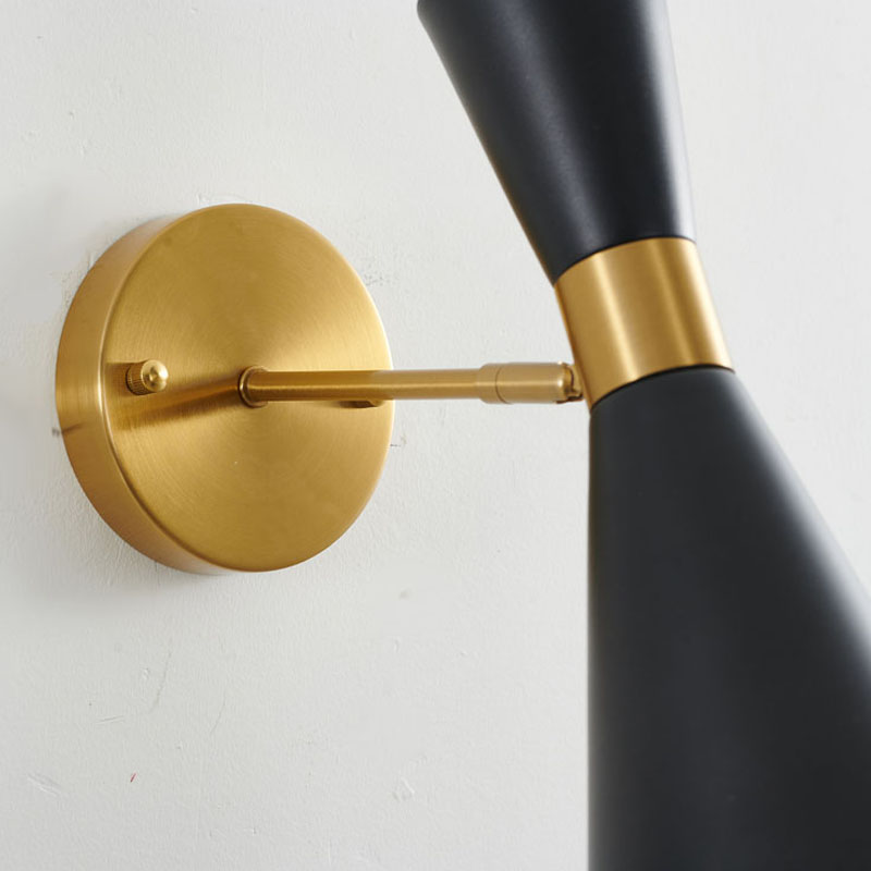 A GOLD FRAME WALL SCONCE WITH A SAND BLACK CONE SHADE