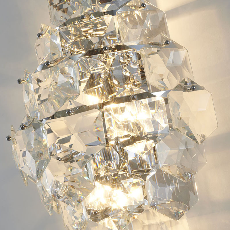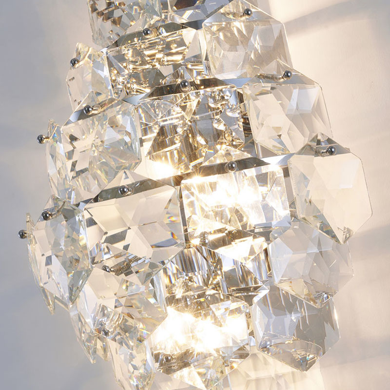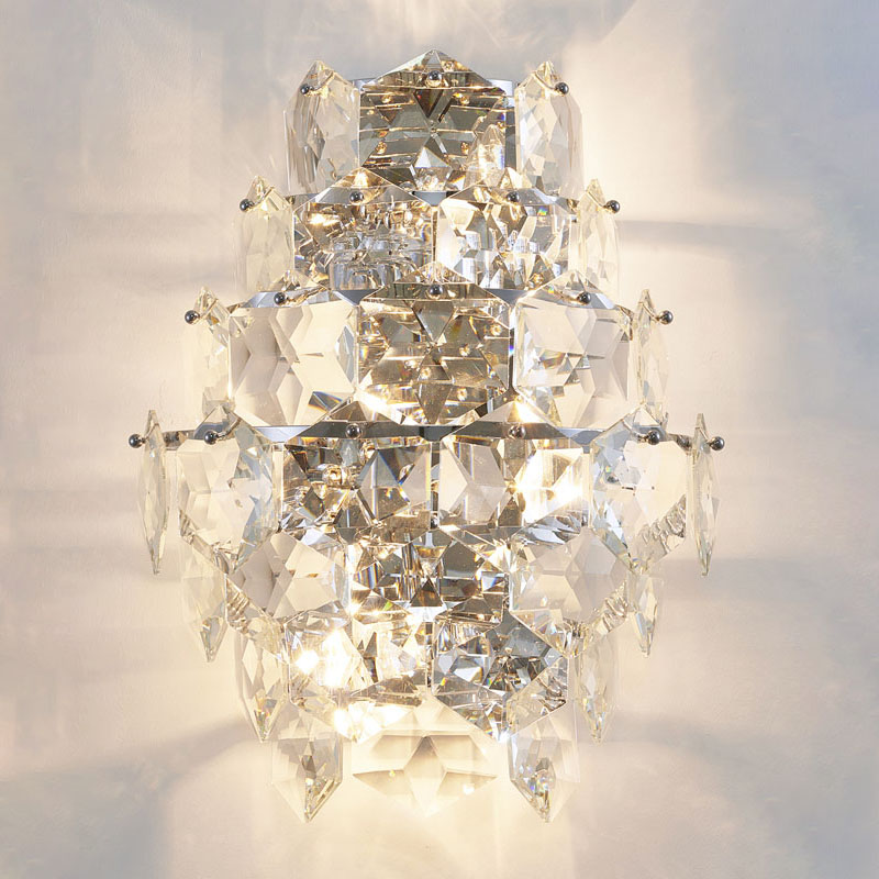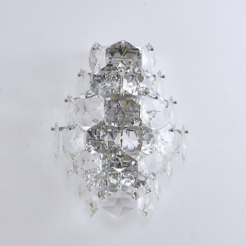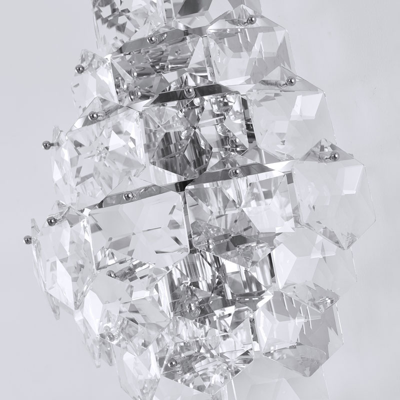 A SEVEN TIER CHROME STAINLESS STEEL FRAME WALL SCONCE WITH CLEAR HANGING CRYSTALS