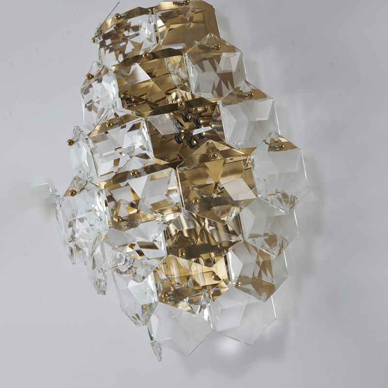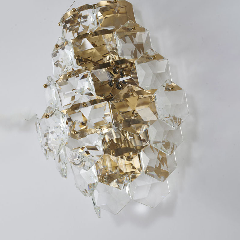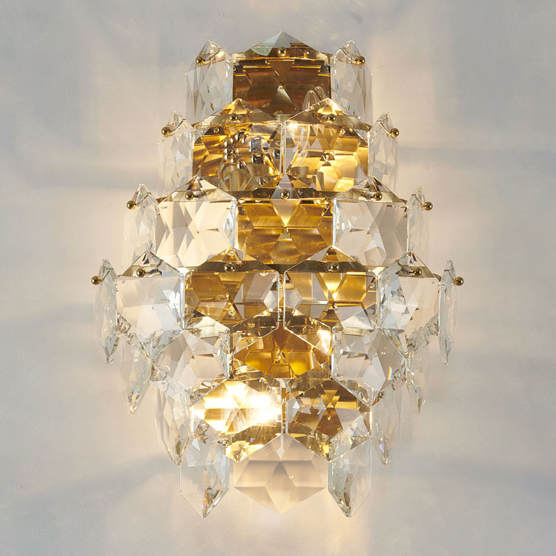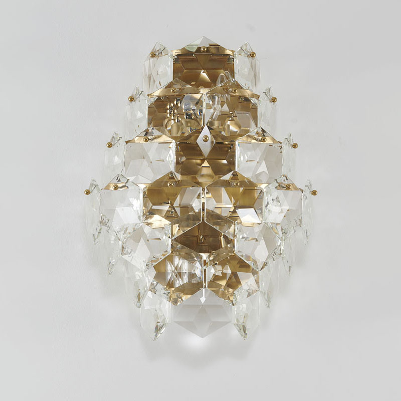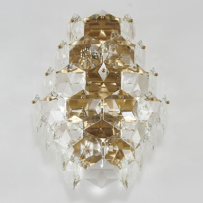 A SEVEN TIER GOLD STAINLESS STEEL FRAME WALL SCONCE WITH CLEAR HANGING CRYSTALS
